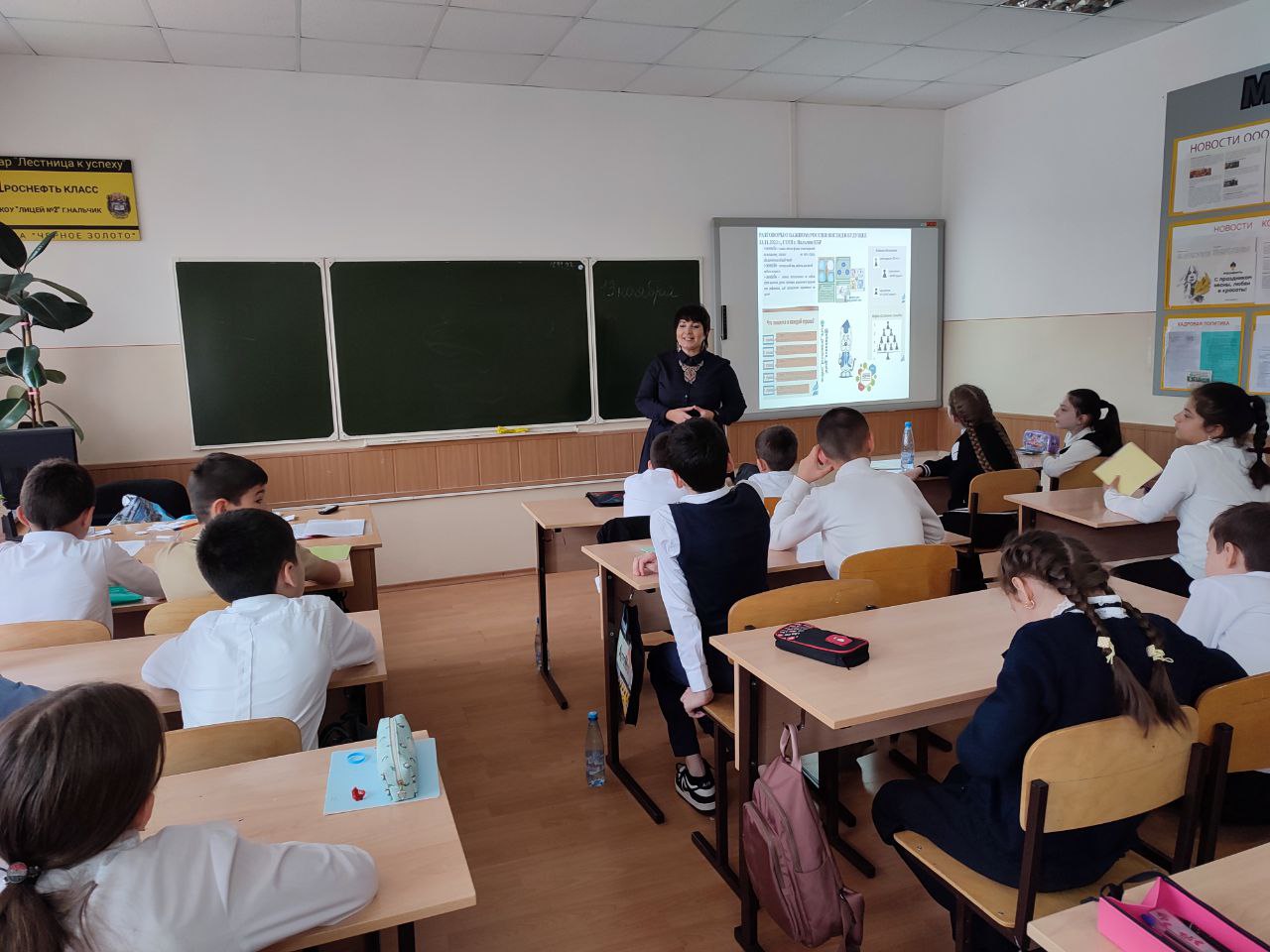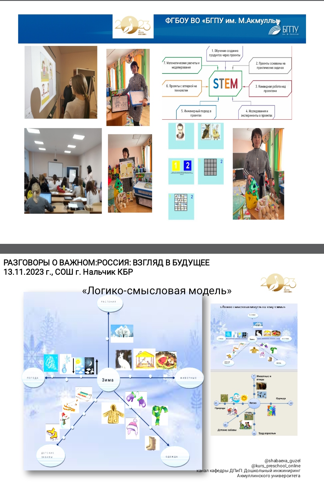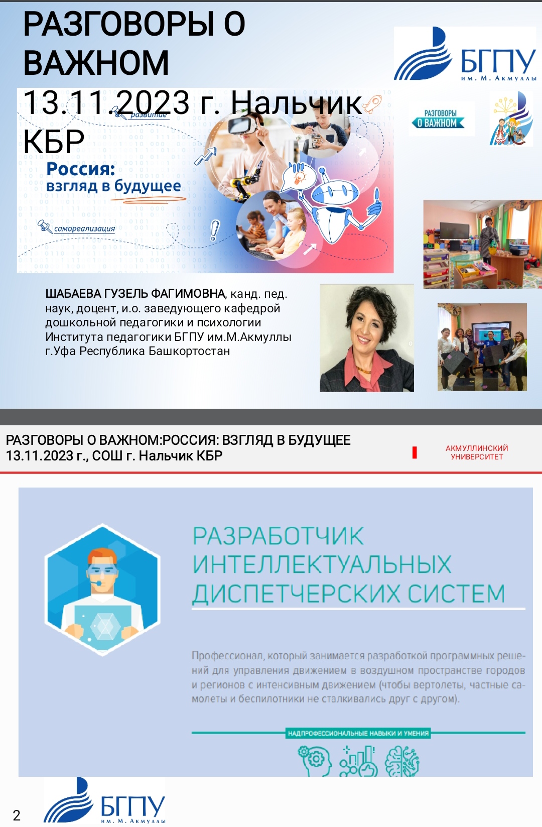 13 ноября 2023 г. Шабаева Гузель Фагимовна, кандидат педагогических наук, доцент, и.о. заведующего кафедрой ДПиП Института педагогики БГПУ имени Мифтахетдина Акмуллы провела с обучающимися 4 классов МКОУ «Лицей №2» г.о. Нальчик КБР тематическую беседу в рамках реализации Всероссийского проекта "Разговоры о важном" : «РОССИЯ: ВЗГЛЯД В БУДУЩЕЕ».