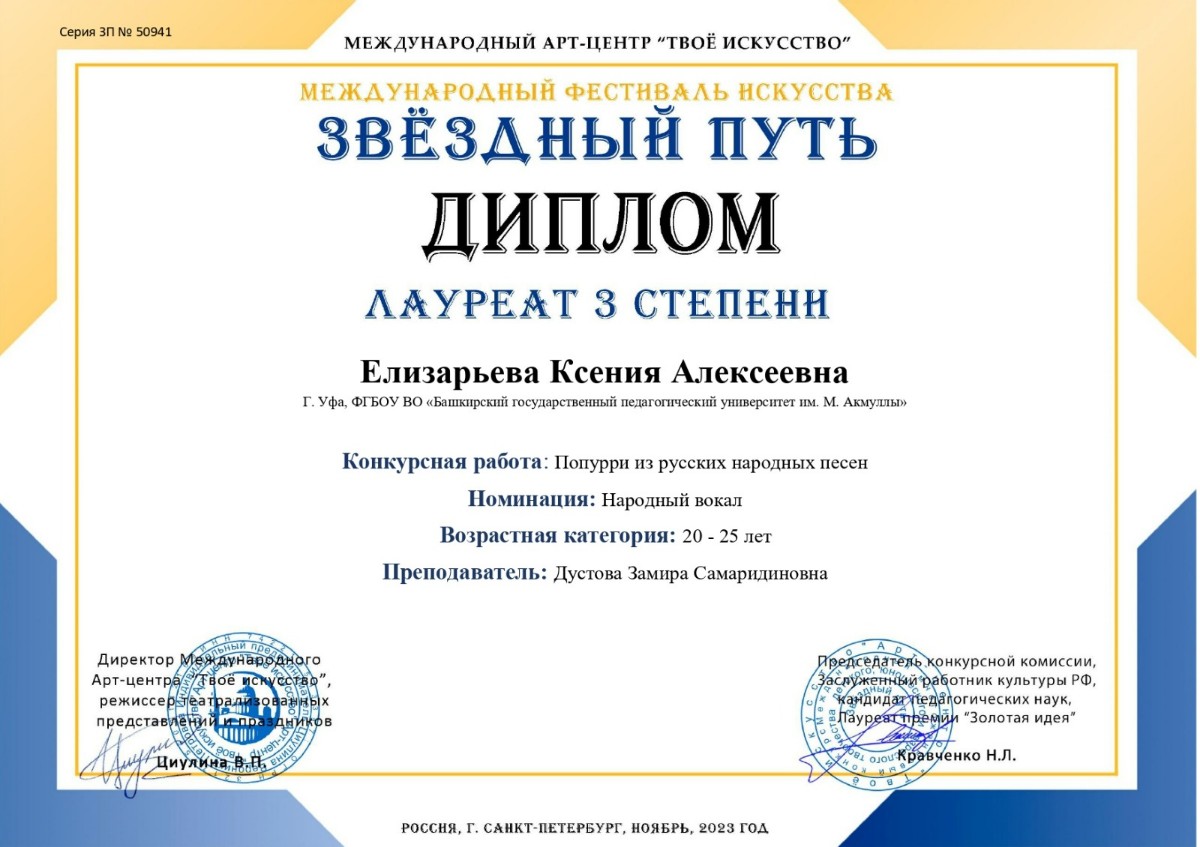 В ноябре 2023 года в г. Санкт-Петербург состоялся  Международный многожанровый конкурс детского, юношеского и взрослого творчества «Звездный путь», в котором приняли участие  студенты музыкального отделения кафедры музыкального и хореографического образования Института педагогики БГПУ им. М. Акмуллы.