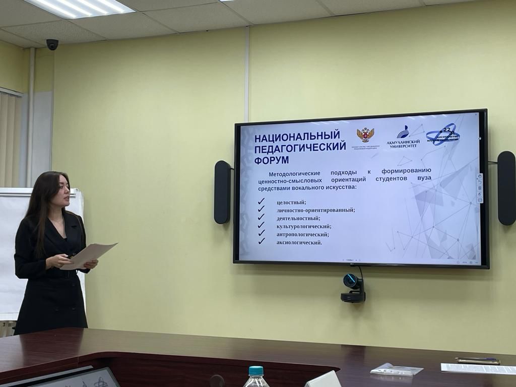 Старший преподаватель Замира Дустова представила доклад на тему «Современные подходы к формированию ценностно-смысловых ориентаций средствами вокального искусства в электронной образовательной среде». В ходе выступления были раскрыты особенности применения электронных образовательных ресурсов и информационно-коммуникативных технологий в вокально-педагогической деятельности.