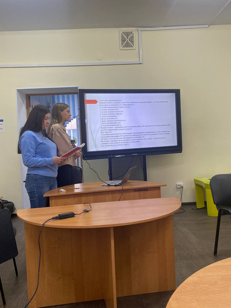 8 декабря 2023 г. студенты 3 курса Мунасипова Альфия и Марченко Мария выступили в качестве дублера старшего преподавателя В.В. Панной, проведя практическое занятие в рамках дисциплины «Методология и методика психолого-педагогических исследований в дошкольном образовании» для студентов первого курса, обучающихся по направлению Дошкольное образование. На занятии студенты познакомились с содержанием и особенностями подготовки пакета диагностических методик по теме исследования (курсовой работы).