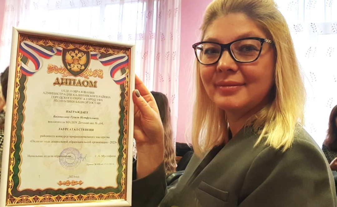 17 ноября 2023 года завершился районный этап профессионального конкурса "Педагог года 2023". Воспитатель детского сада МАДОУ д /с 264 г.Уфа, магистрант кафедры ДПиП Института педагогики БГПУ имени Мифтахетдина Акмуллы БОГОМОЛОВА Гузель Нутфулловна  блестяще прошла все этапы данного конкурса и стала Лауреатом 1 степени. Поздравляем!!! Желаем успехов! Гордимся!