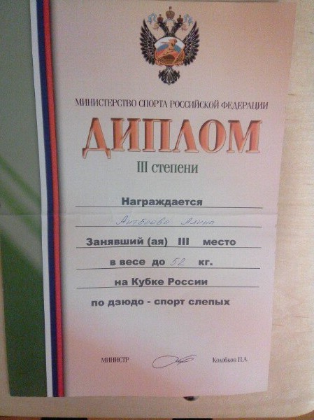 С 9 по 11 декабря 2016 г. вручили ДИПЛОМ в Москве студентке 1 курса направления подготовки «Психолого - педагогическое образование» по профилю подготовки «Дошкольное образование», члену сборной команды университета по самбо и дзюдо спортивного клуба «Арслан» ФГБОУ ВО «БГПУ им.М.Акмуллы» - Аитбаевой Алине, занявшей 3 место на КУБКЕ РОССИИ по дзюдо среди людей с ограниченными возможностями здоровья (по зрению). От души и с радостью поздравляем с еще одной победой!!!!!!!!!