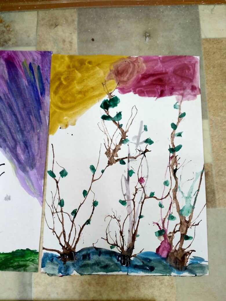 Ирина Хисматуллина:  Мы предложили детям на занятии выполнить работу в необычной технике - кляксография. Эта техника помогает развить фантазию ребенка и увидеть в обычной кляксе что-то интересное, особенное, прекрасное. По рисункам детей  можно было понять, каким они видят мир. Мы детям  дали  полную свободу в выборе цветов. Большинство детей рисовали яркими, красными, желтыми цветами. Детям урок очень понравился, они узнали, что из простой кляксы можно сделать необычный рисунок. Каждый показал свою индивидуальность в своей работе.