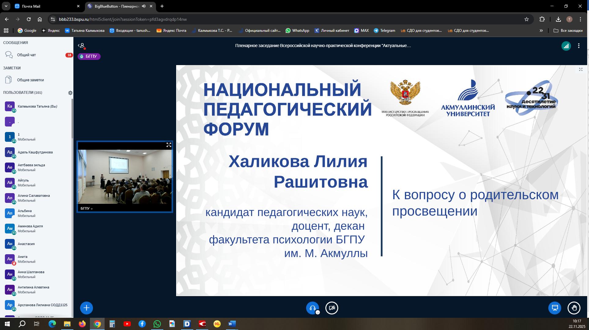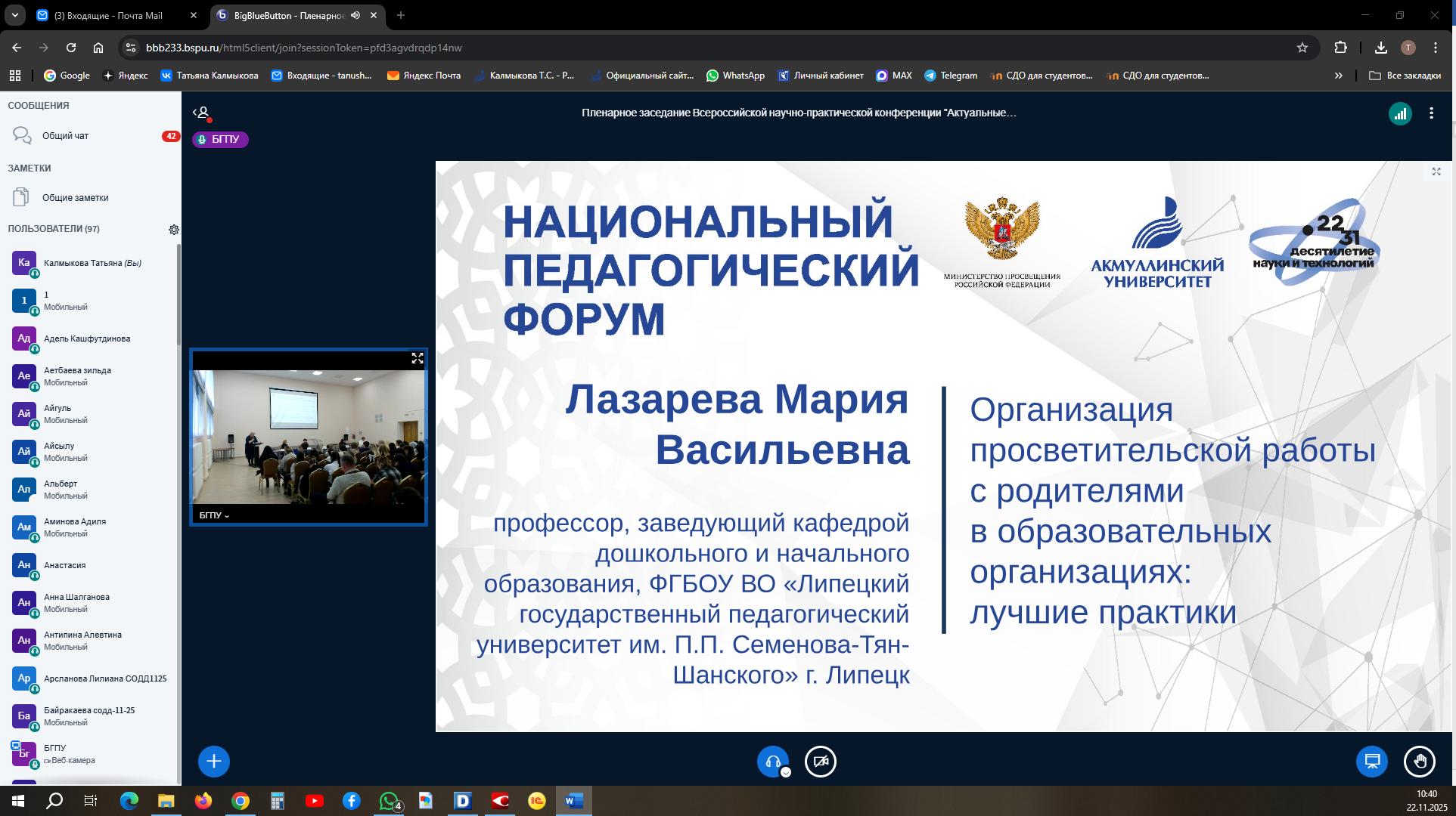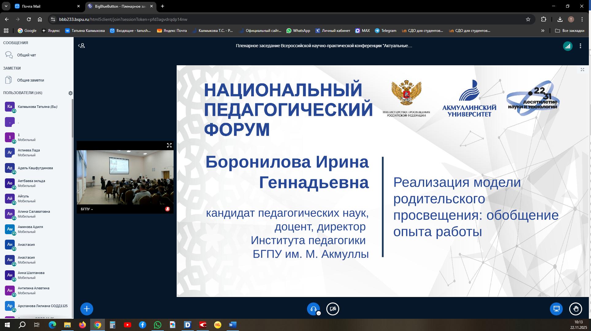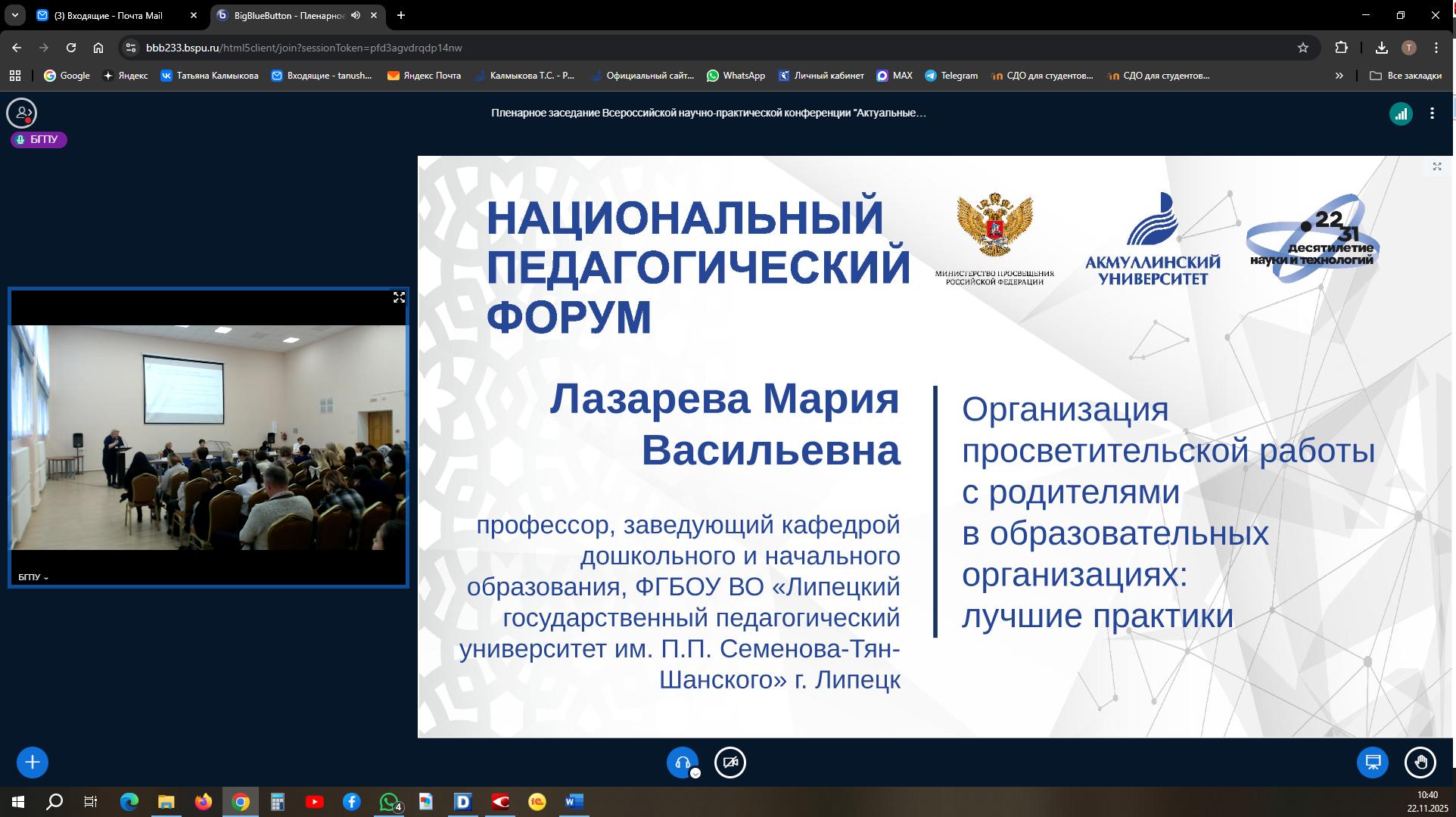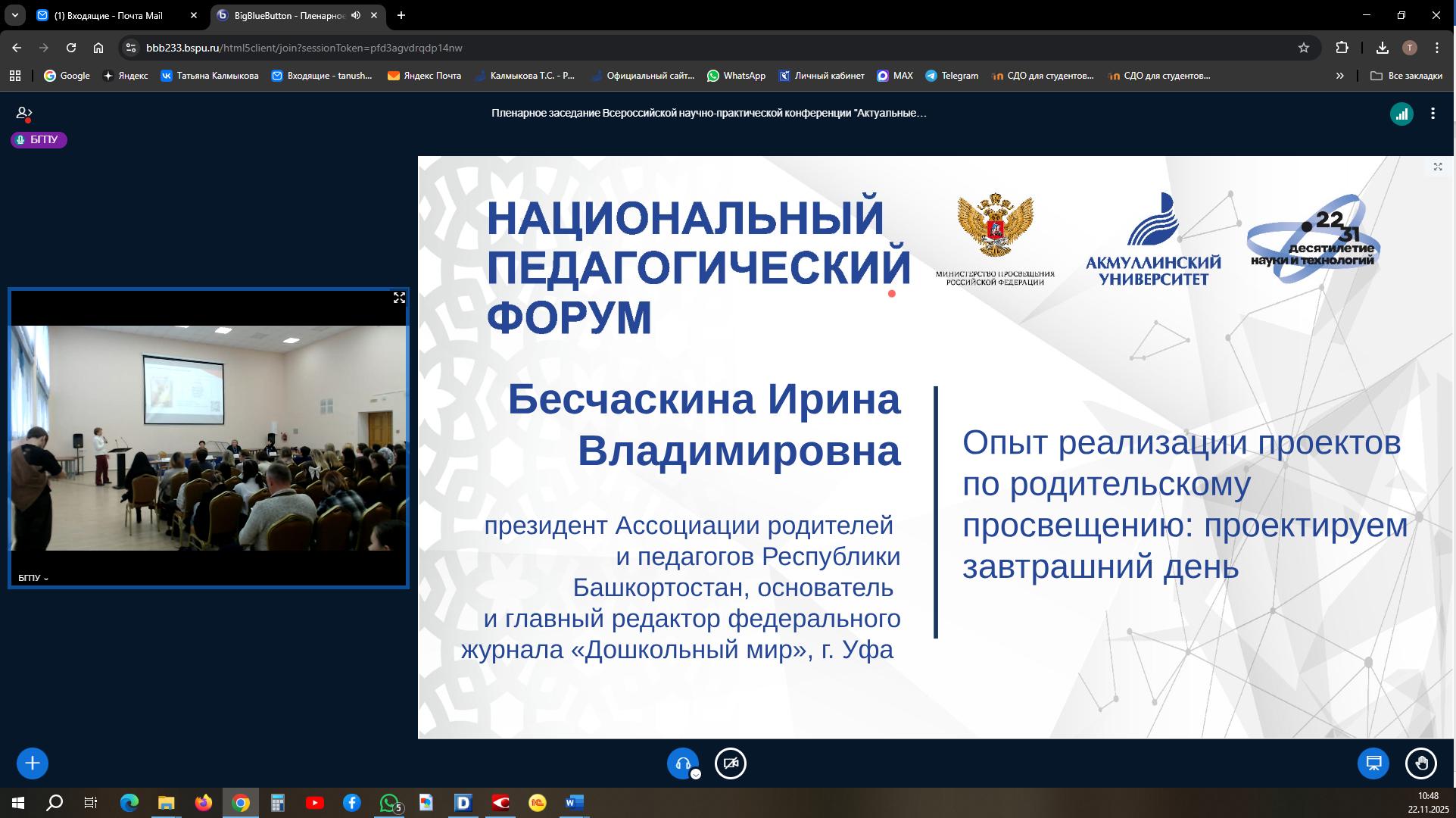 22 ноября 2025 года в Башкирском государственном педагогическом университете имени М. Акмуллы состоялась Всероссийская научно-практическая конференция «Актуальные вопросы теории и практики родительского просвещения». Она прошла в рамках Национального педагогического форума и собрала широкий круг участников, среди которых были ученые и педагоги в сфере высшей педагогической школы всероссийского, регионального уровней образования, представители научных школ и ведущих научных коллективов вузов, новаторы дошкольного, школьного, среднего профессионального и высшего педагогического образования. В конференции также приняли участие представители педагогических ассоциаций и родительских сообществ, педагоги, ответственные за организацию родительского просвещения, классные руководители, заместители директоров по воспитательной работе, социальные педагоги, педагоги-психологи, студенты, аспиранты. Отмечается широкая география участников конференции: свои доклады представили ученые Уфы, Москвы, Санкт-Петербурга, Липецка, Магнитогорска, Карачаево-Черкесской и Кабардино-Балкарской Республик. Данная конференция организована в рамках выполнения государственного задания по теме «Разработка модели родительского просвещения в учреждениях начального и основного общего образования».