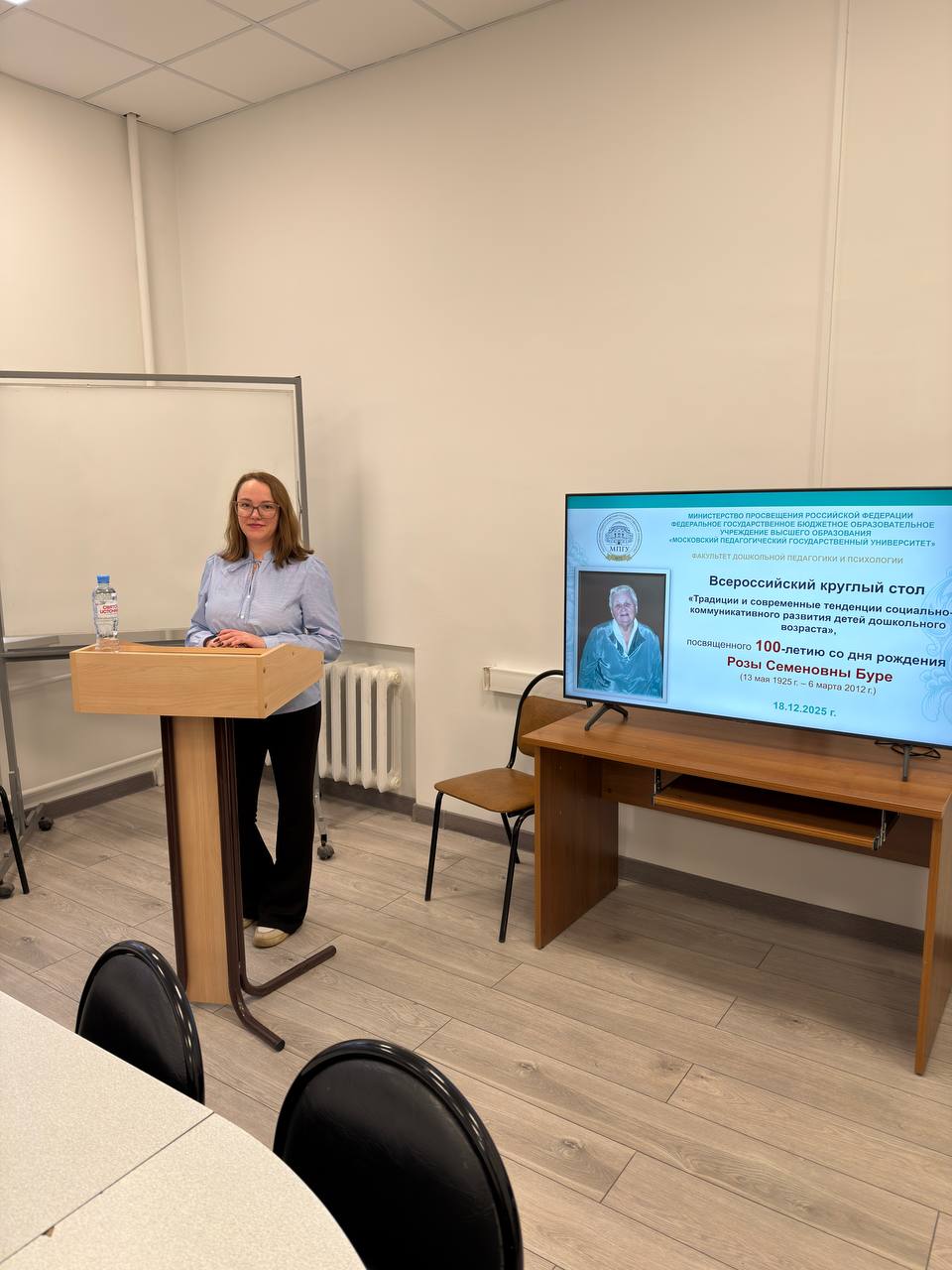 18.12.2025г. старший преподаватель кафедры дошкольной педагогики и психологии Калмыкова Татьяна Сергеевна и преподаватель кафедры дошкольной педагогики и психологии Кинцель Валентина Николаевна приняли участие во Всероссийском круглом столе «Традиции и современные тенденции социально-коммуникативного развития детей дошкольного возраста», посвященного 100-летию со дня рождения Розы Семеновны Буре организованной Факультетом дошкольной педагогики и психологии ФГБОУ ВО «Московского педагогического государственного университета». Цель круглого стола - обсуждение научного наследия Р.С. Буре в контексте вызовов современного образования, обмен практическим опытом и определение перспективных векторов работы по социально-коммуникативному развитию детей дошкольного возраста.