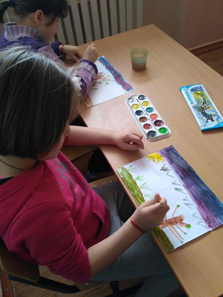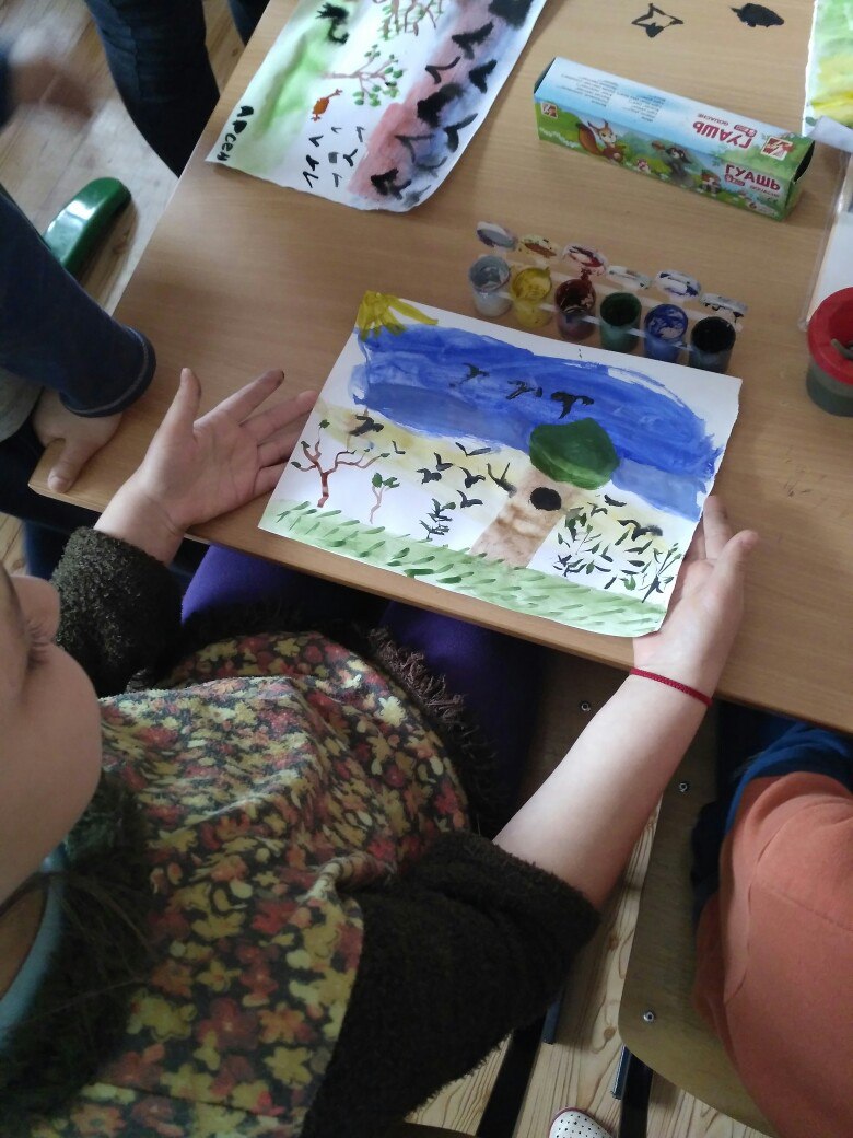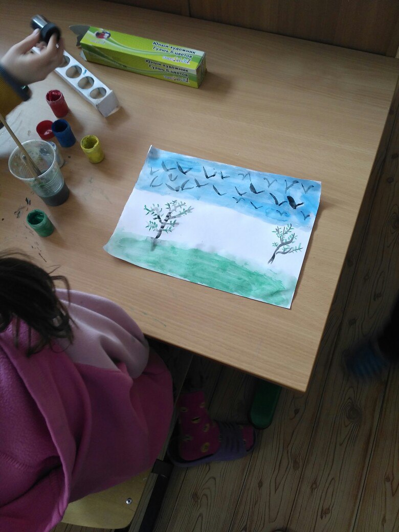 Ирина Хисматуллина: «Сегодняшнее занятие мы посвятили приходу весне. Урок всем ребяткам очень понравился и все остались довольны. Мы дали детям полную свободу в выборе цветов. Весенний пейзаж поднял всем настроение. Во время работы, мы вспомнили много загадок и песен, посвященных природе».