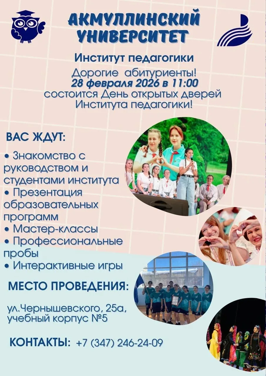 28 февраля 2026 года в 11.00ч. в Институте педагогики Башкирского государственного педагогического университета им. М. Акмуллы состоится День открытых дверей для абитуриентов и их родителей.