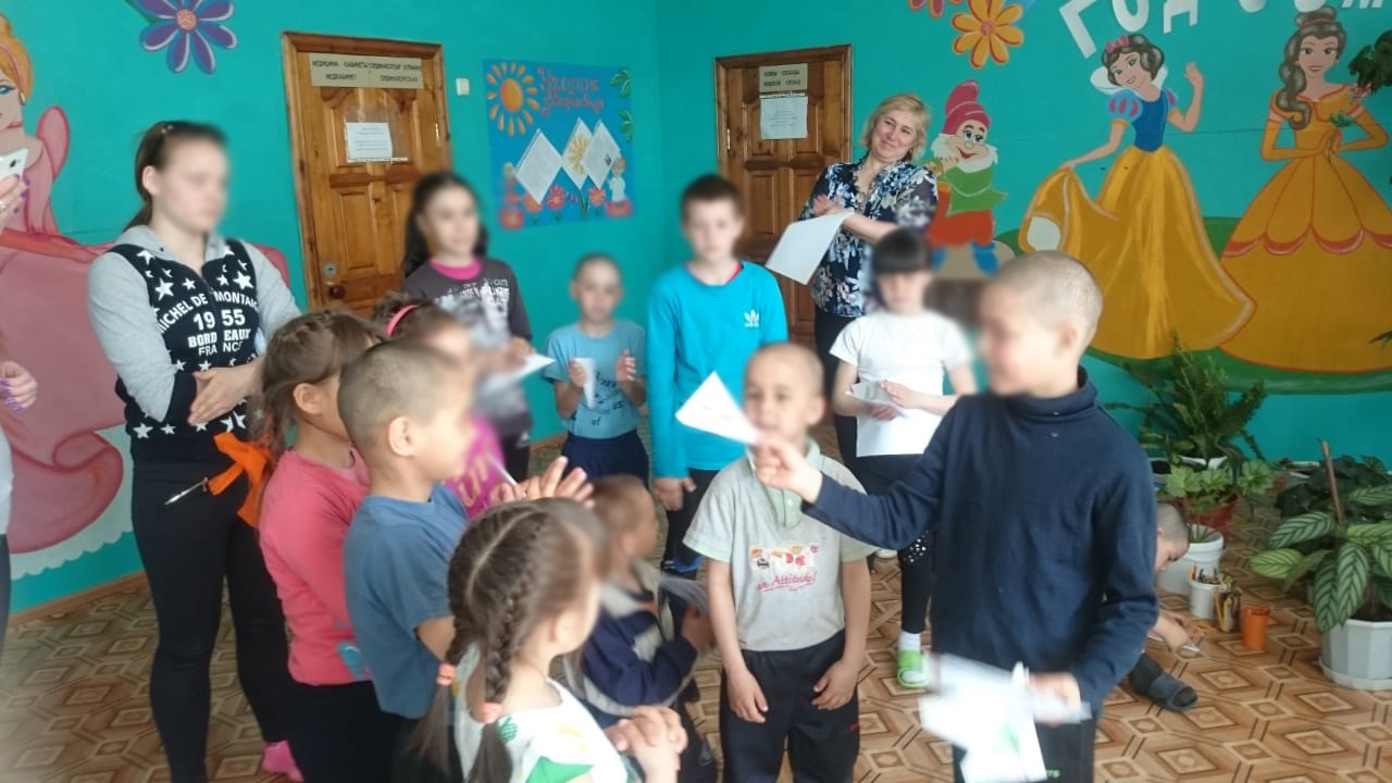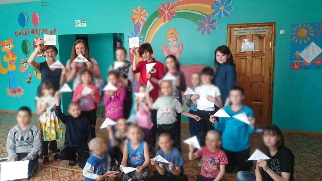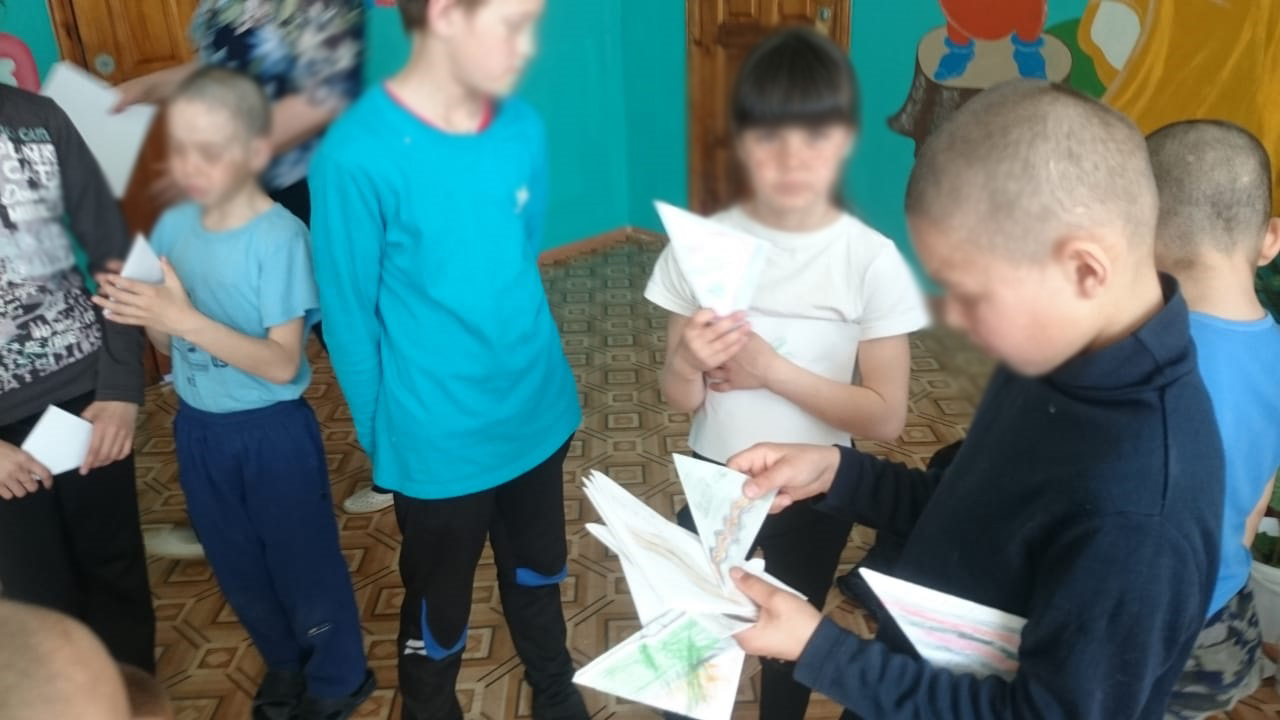 Екатерина Ларькова: 13 мая мы побывали в очень красивом месте в селе Еланлы, в котором расположен приют для детей и подростков. Вокруг села  - высокие горы, бежит речушка, пасутся стада коров, овечек, табуны лошадей. Нас в приюте очень тепло встретили воспитатели и дети, мы играли  с ними в настольные игры-лото. Дети с удовольствием играли, были внимательными, активными, загадывали загадки, пели песни, отгадывали на ощупь предметы военного времени, складывали фронтовое письмо-треугольник, рисовали. После проведения лото мы вышли с детьми на прогулку и поиграли в подвижные и спортивные игры, пообщались с ребятами. Отзывчивые ребята, старшие помогают младшим, заботятся, подсказывают, обучают. Прощаясь с нами дети пригласили нас в гости вновь и сказали, что с удовольствием будут играть в игры!