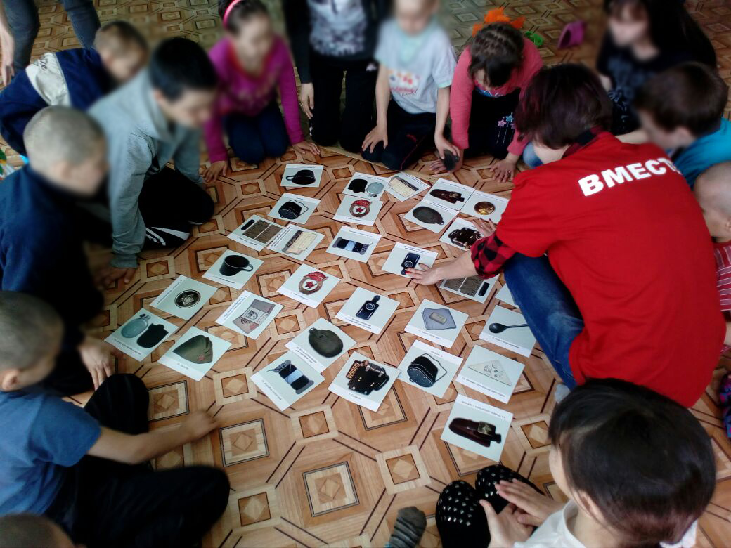 13 мая 2018 года  руководителем проекта «Настольные игры о Родине» РОМДД «Вместе», доцентом кафедры теорий и методик начального образования БГПУ им. М. Акмуллы  Екатериной Савельевой и волонтером РОМДД «Вместе», студенткой Института педагогики  Екатериной Ларьковой вместе с уфимскими волонтерами Лилией  Мухаметяновой и др.  были проведены игры- лото «Предметы личного пользования солдат и офицеров времен Великой Отечественной Войны 1941-1945 гг.» и «Достопримечательности Уфы» для для воспитанников в социального приюта в Кигинском районе в селе  Еланлино.