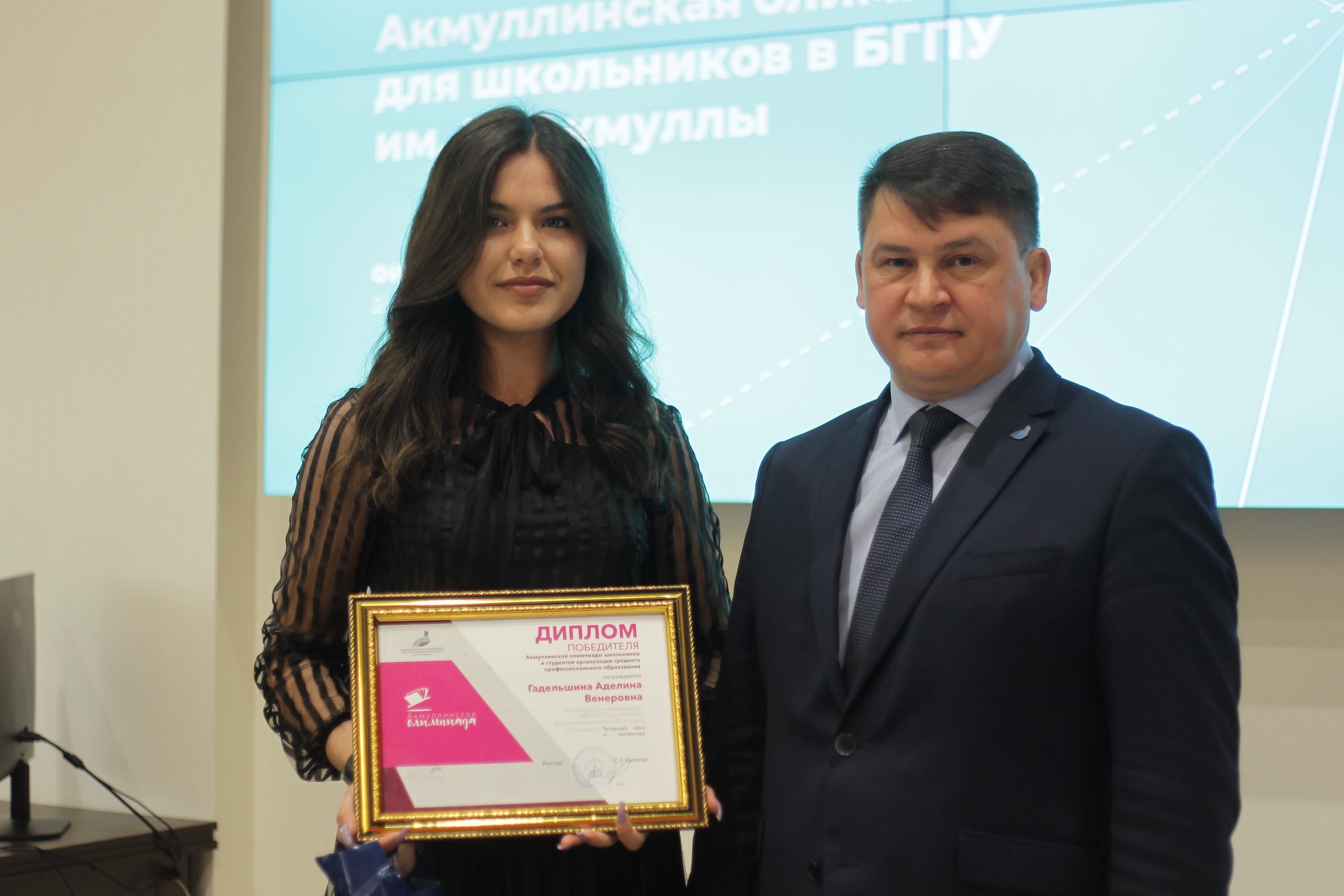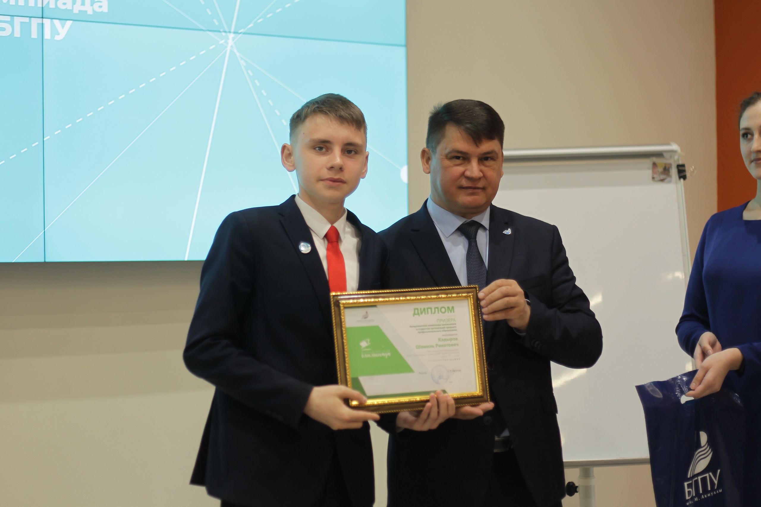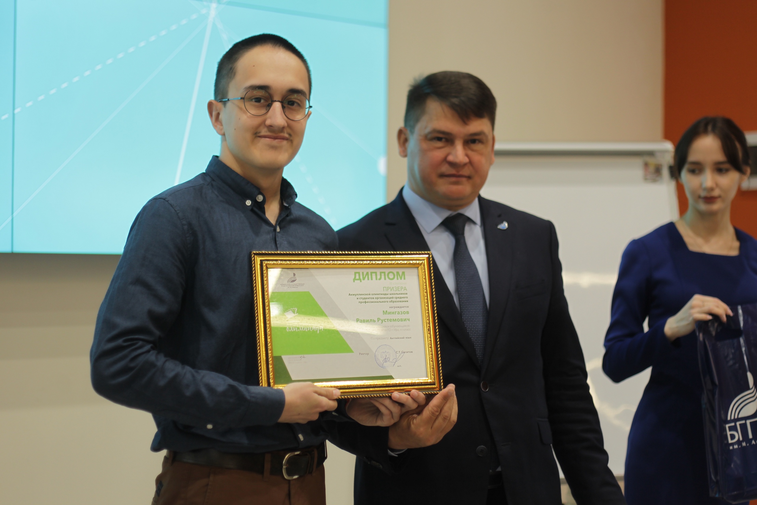 Проректор по воспитательной, социальной и образовательной политике БГПУ им. М. Акмуллы Винер Шаяхметов выступил с приветственными словами. Он также напомнил, в 2021 году Акмуллинская олимпиада вошла в перечень олимпиад Министерства Просвещения России. Поэтому уже с 2022 года её победители смогут получить дополнительные баллы при поступлении не только в БГПУ им. М. Акмуллы, но и в другие вузы страны. Далее состоялось вручение дипломов победителей и призеров.