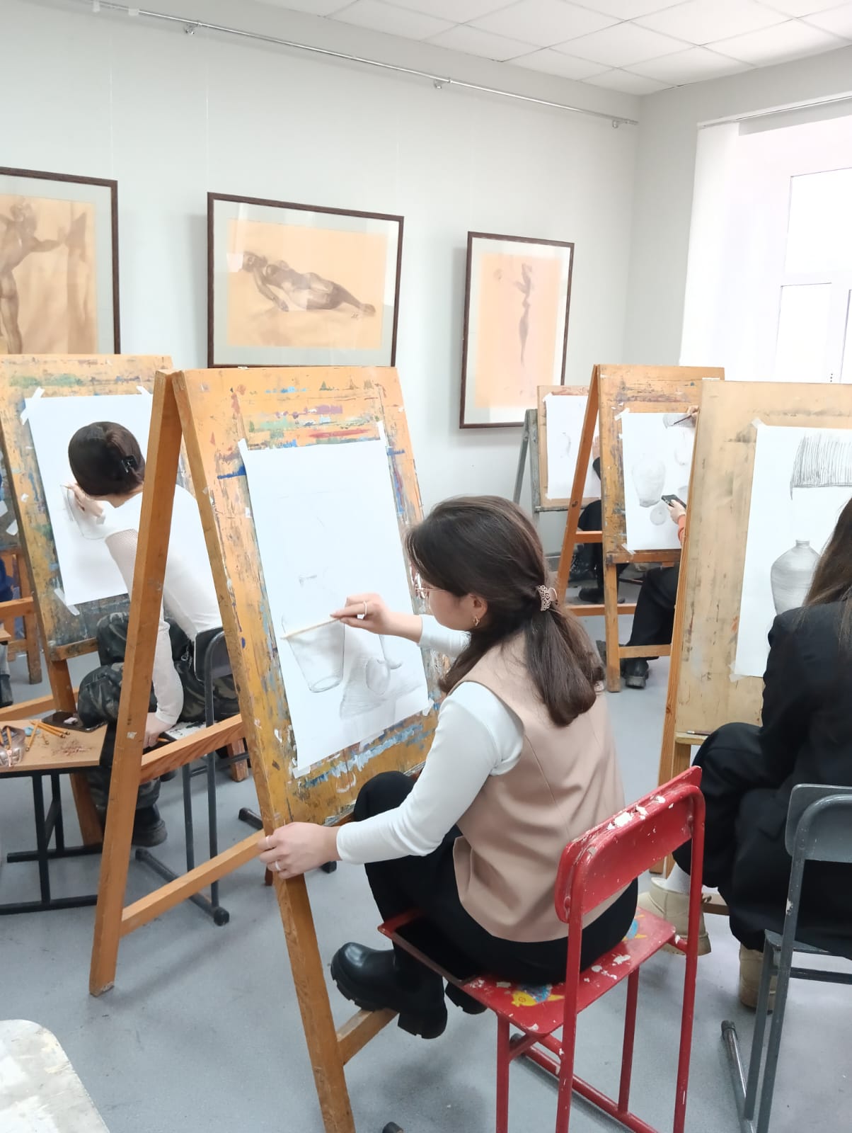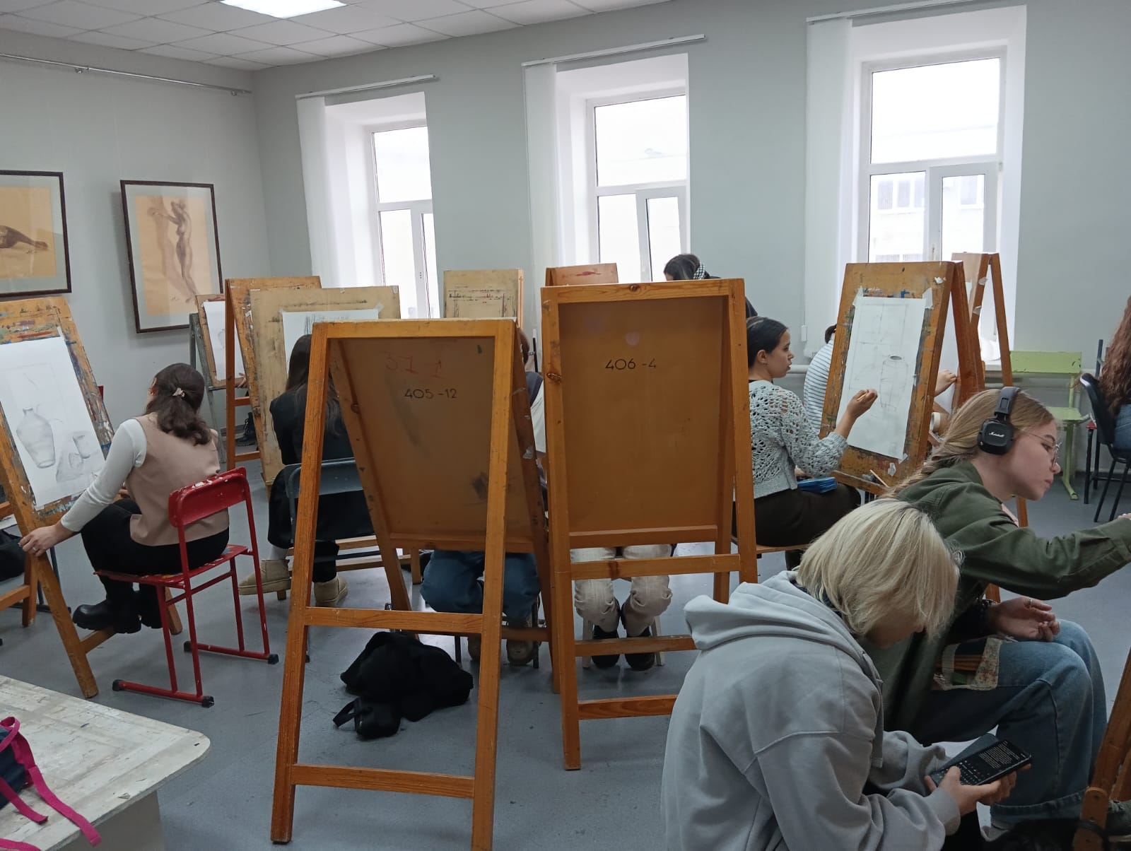 На художественно-графическом факультете состояла консультация и пробный экзамен по творческому экзамену «Академический рисунок». Школьники рисовали натюрморт с гипсовой розеткой и получили разбор наиболее распространенных ошибок.