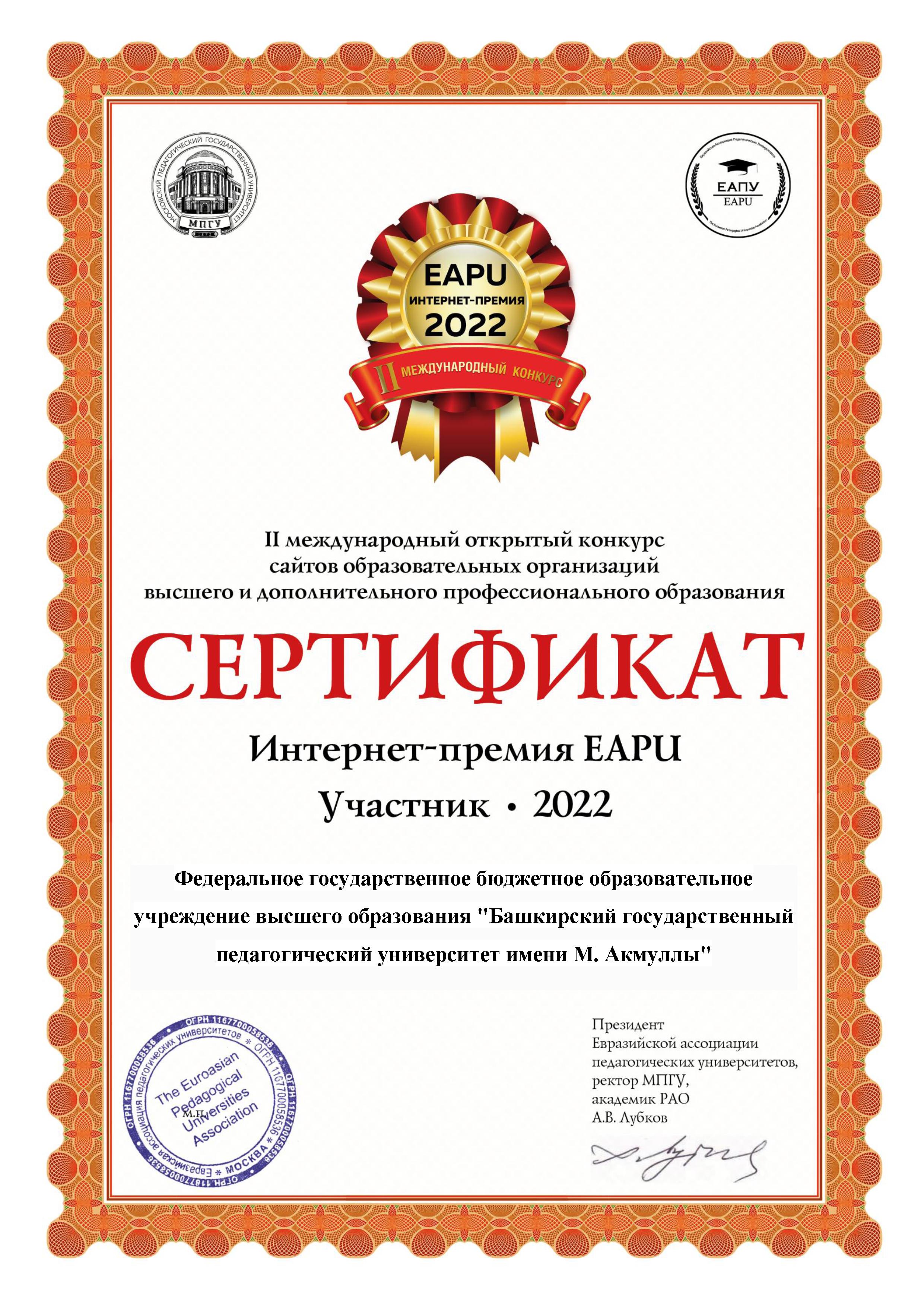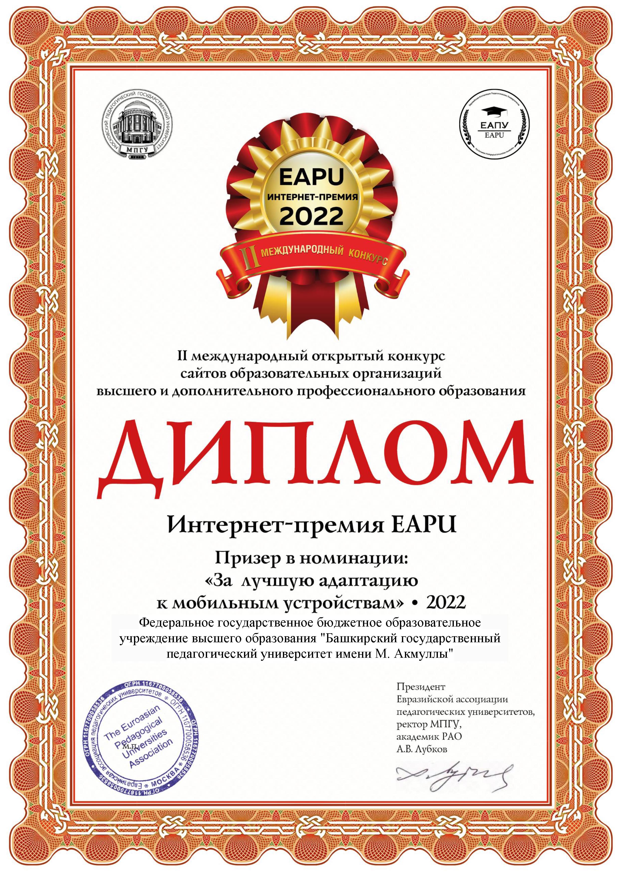 Сайт БГПУ им. М. Акмуллы стал призёром сразу в двух номинациях II международного Открытого конкурса сайтов образовательных организаций высшего и дополнительного профессионального образования «Интернет-премия EAPU- 2022».