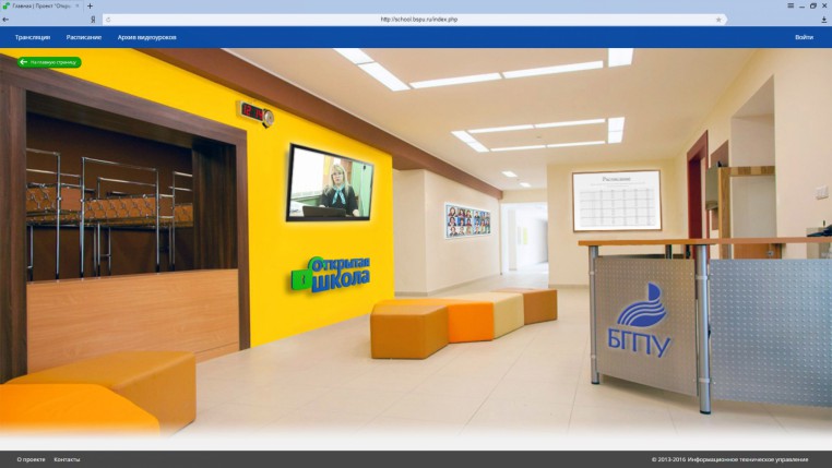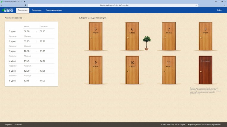 Для реализации работы в данном направлении информационно-техническим управлением разработана концепция проекта «Открытая школа», в логике которой сотрудниками отдела модернизирован сайт проекта расположенный по адресу http://school.bspu.ru. На сайте организованы онлайн-трансляции уроков в соответствии с единым республиканским расписанием, представлен архив уроков для доступа к учебным материалам в любое время. Интерфейс ресурса специально спроектирован максимально простым, главная страница - это визуализации здания инновационной школы, а страница выбора класса трансляции выполнена в виде дверей в учебные кабинеты, что в совокупности переносит обучающегося в процесс обучения.