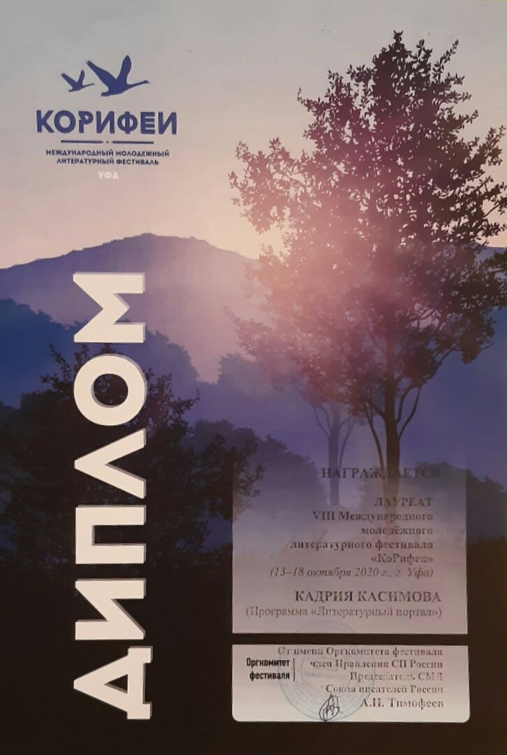 Студентка 1 курса направления подготовки «История, обществознание» Касимова Кадрия стала лауреатом в программе «Литературный портал», за что и была награждена именным дипломом.