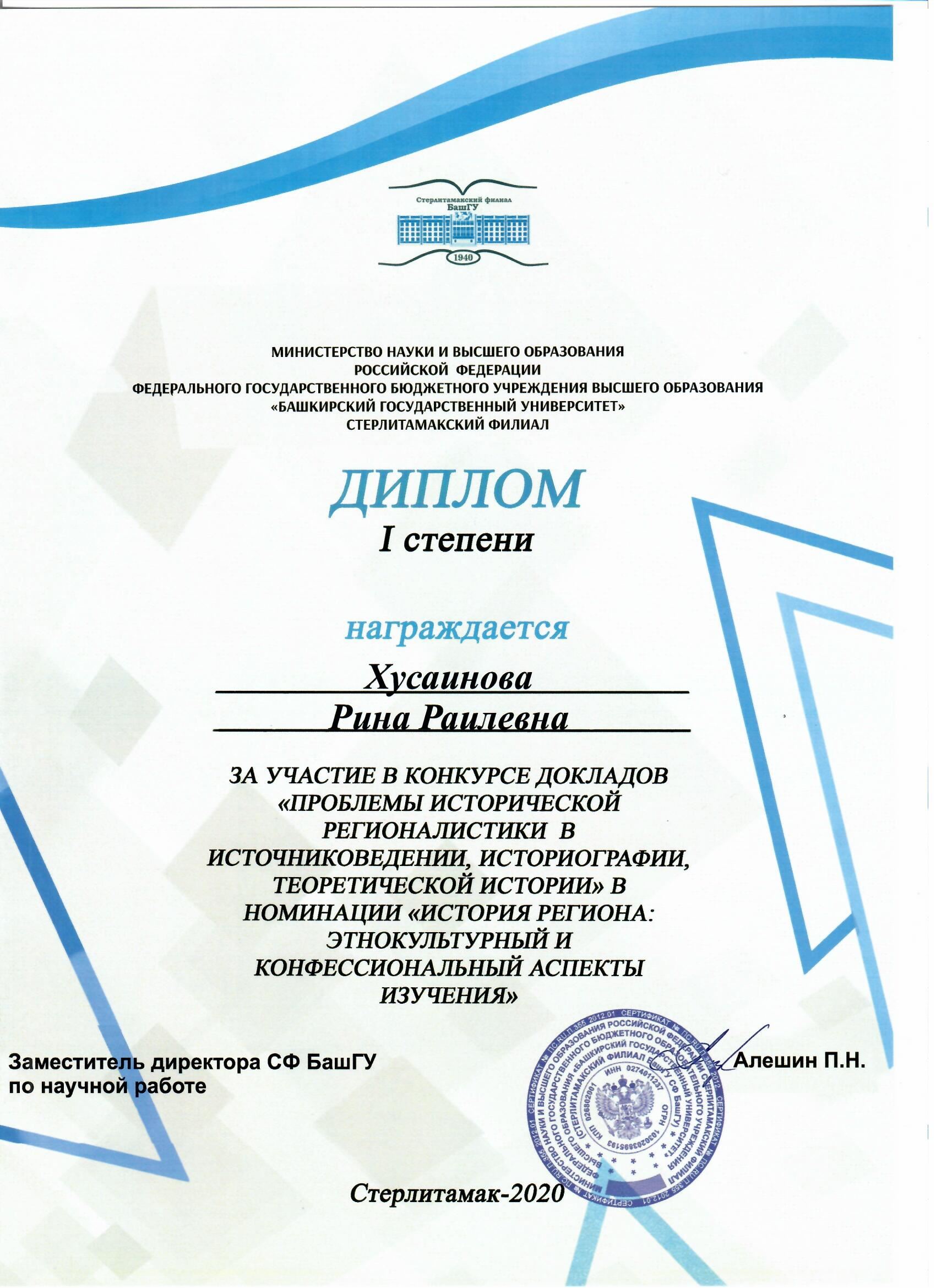 Рина Хусаинова студентка 3 курса ИИПСГО направление (Педагогическое образование. Первый профиль История) с докладом «Представление башкир о мире в контексте доисламских верований и народных знаний» удостоилась диплома I степени.  Научный руководитель к.и.н., доцент Рустам Закирович Алмаев.