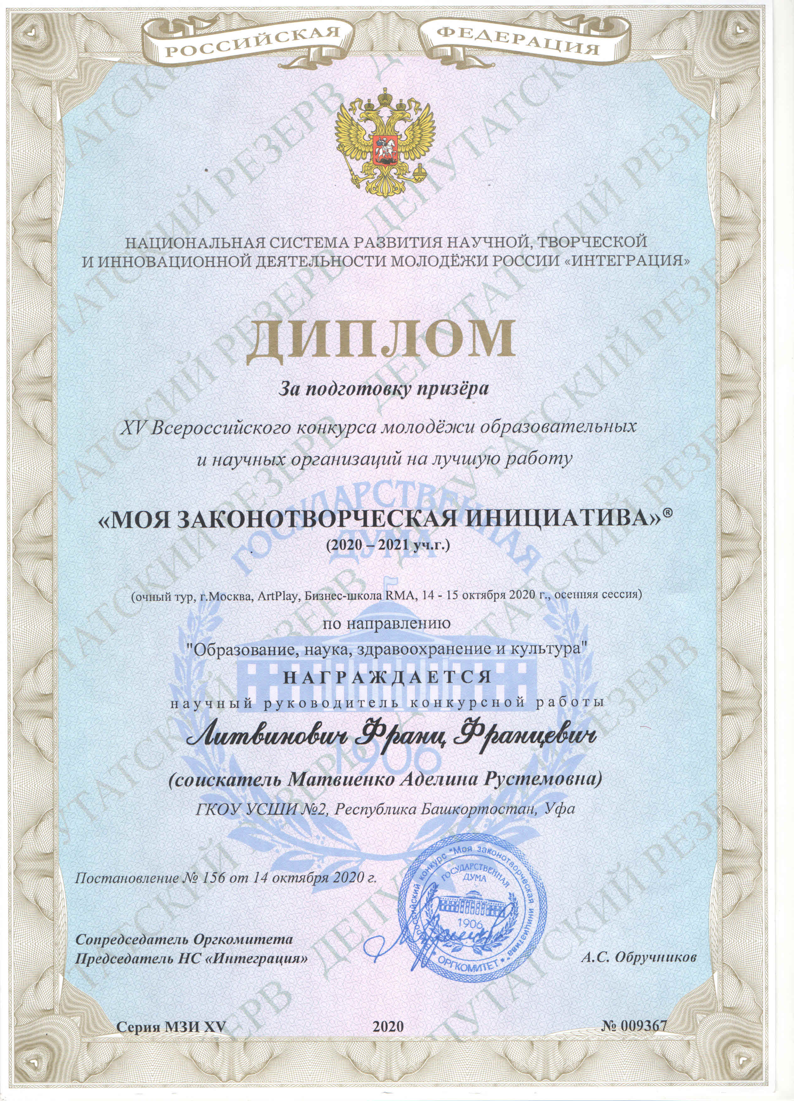 Канд.юрид.наук, доцент кафедры права и обществознания Франц Францевич Литвинович награжден дипломами за подготовку лауреата заочного и призера очного этапа Матвиенко Аделины Рустемовны XV Всероссийского конкурса молодежи образовательных и научных организаций на лучшую работу «Моя законотворческая инициатива» по направлению «Образование, наука, здравоохранение и культура».