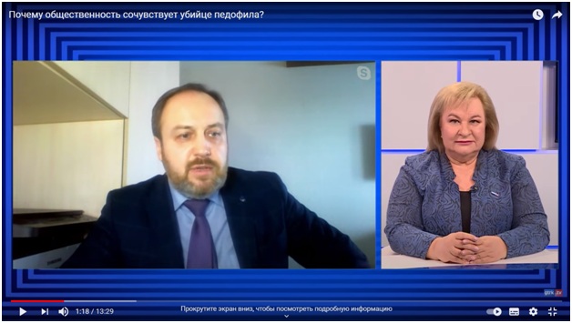 Доцент кафедры права и обществознания БГПУ им. М.Акмуллы Булычев Евгений Николаевич был приглашен на программу «Вести. Интервью», выходящую на телеканалах «Россия— 24. Башкортостан» и «Башкортостан 24». Евгений Николаевич высказал свое мнение по поводу резонансного уголовного дела, возбужденного в отношении Владимира Санкина досмерти избившего мужчину, пытавшегося совершить развратные действия в отношении несовершеннолетних. https://gtrk.tv/proekty/vesti-intervyu/pochemu-obshchestvennost-sochuvstvuet-ubiyce-pedofila