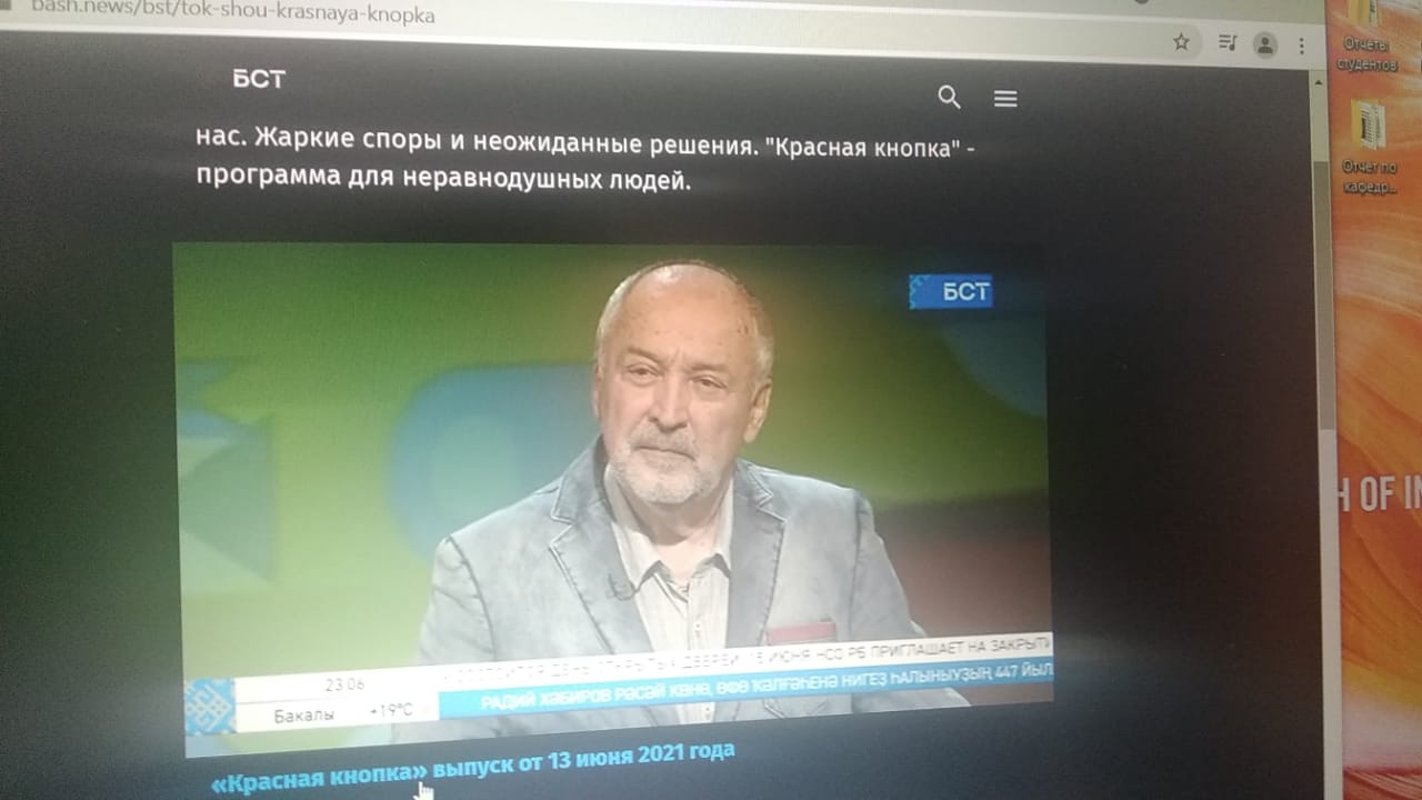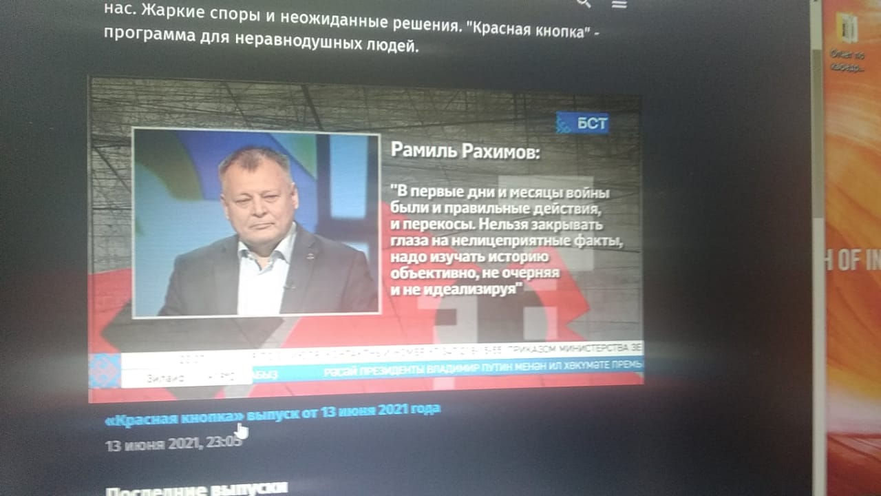 13 июня студенты 4 курса направления подготовки «История, обществознание» Института исторического, правового и социально-гуманитарного образования совместно с доцентами кафедры Отечественной истории Рустамом Алмаевым и Ильдаром Баишевым приняли участие в программе «Красная кнопка» на телеканале БСТ. Темой для обсуждения стало 80-летие начала Великой Отечественной войны. Обсуждались вопросы всеобщей мобилизации, патриотизма населения, сохранения исторической памяти о войне. Особое внимание было уделено патриотическому воспитанию молодежи предвоенных лет. В качестве спикеров выступили – к.и.н, заведующий кафедрой истории России, историографии и источниковедения БашГУ Рамиль Рахимов и к.филос.н.заведующий кафедрой социальных и политических коммуникаций УГНТУ Эдуард Гареев. В качестве экспертов в программе приняли участие преподаватели вузов, журналисты, музейные работники, общественные деятели.