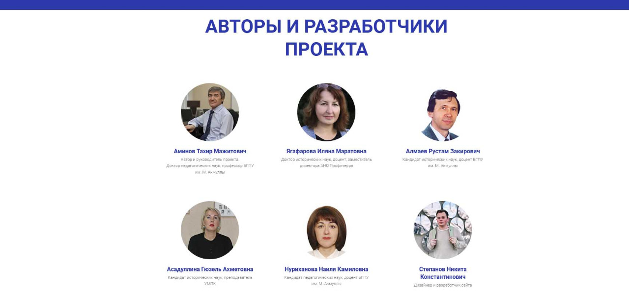 - автор и руководитель проекта - Аминов Тахир Мажитович, доктор педагогических наук, профессор БГПУ им. М. Акмуллы; - Ягафарова Иляна Маратовна, доктор исторических наук, доцент, заместитель директора АНО Профитерра;