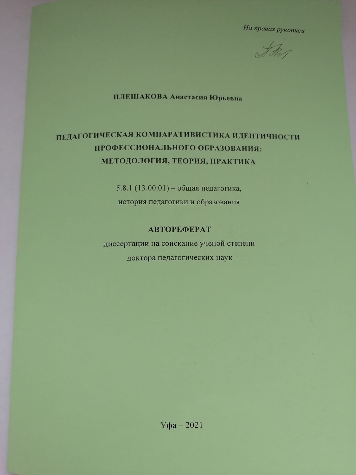 23 декабря 2021 г. в диссертационном совета Российского государственного профессионально-педагогического университета состоялась успешная защита диссертации на соискание ученой степени доктора педагогических наук Анастасии Юрьевны Плешаковой на тему "Педагогическая компаративистика идентичности профессионального образования: методология, теория, практика". Работа выполнена в докторантуре БГПУ им. М. Акмуллы. Научный консультант д.п.н., профессор Владислав Львович Бенин.