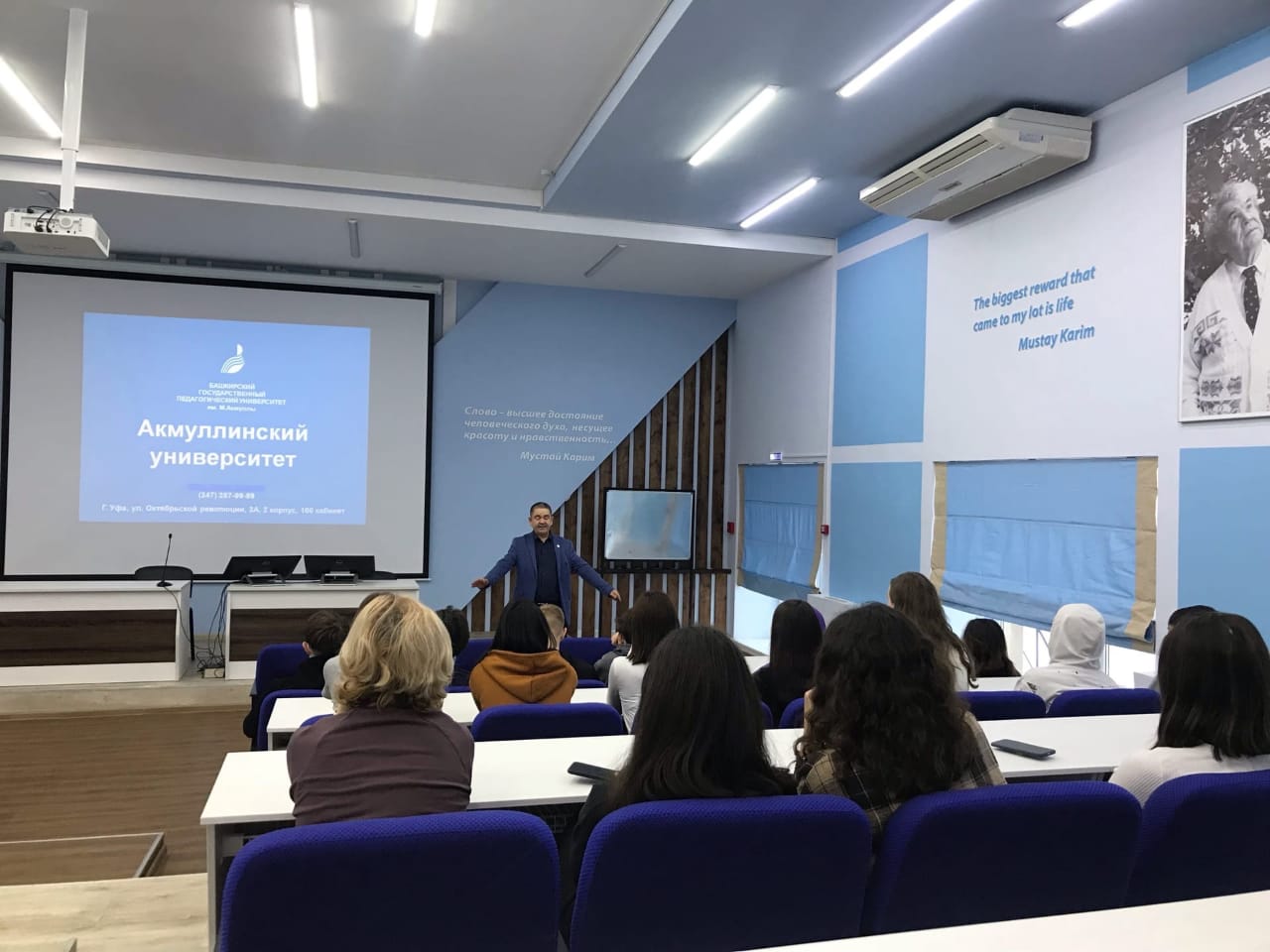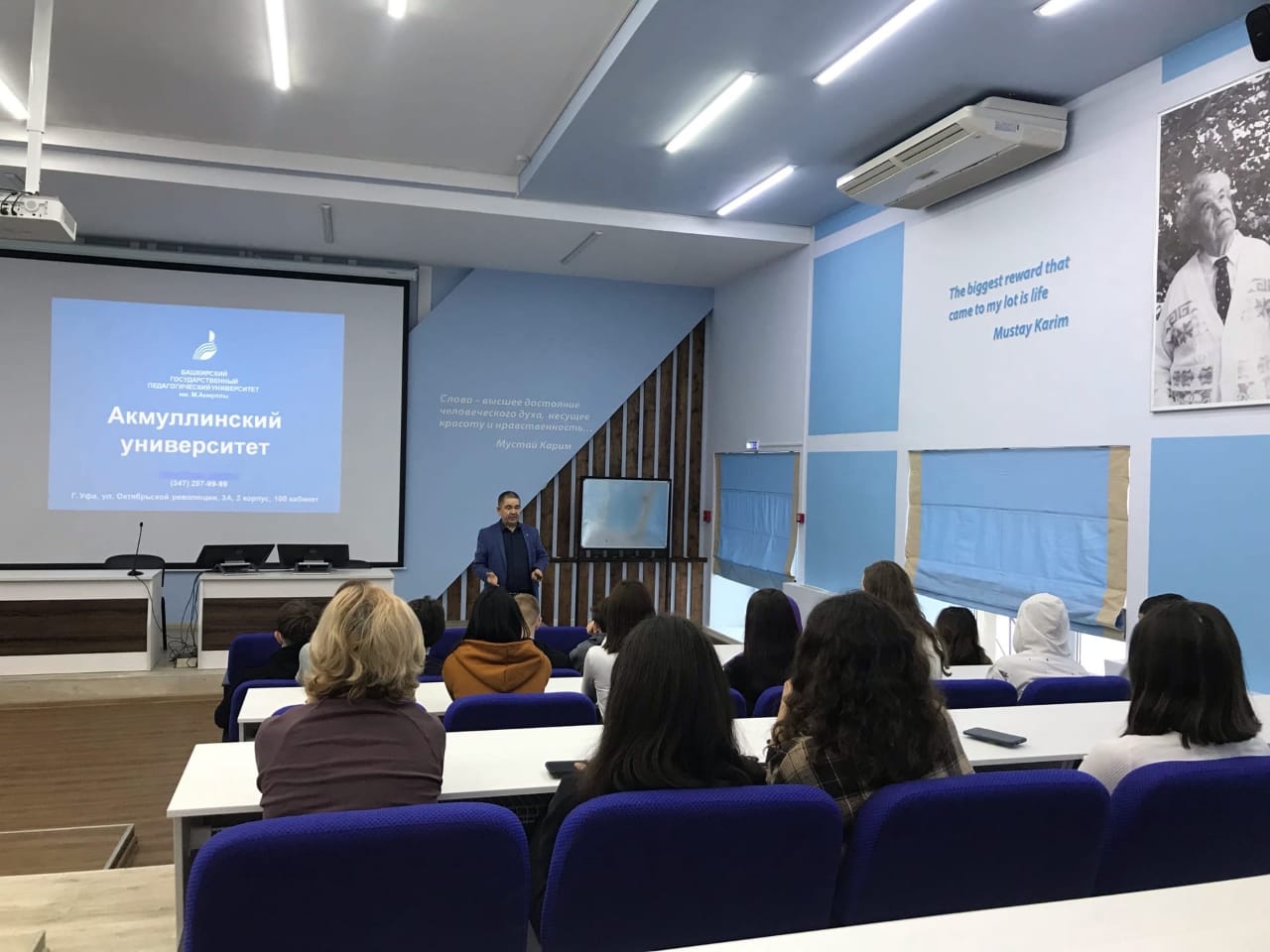 23 декабря 2021 г. в 401 аудитории 3 корпуса Акмуллинского университета состоялась очередная профориентационная тематическая встреча, организованная сотрудниками Центра профориентации нашего вуза. Перед учащимися 10-11 классов Бакалинского района Республики Башкортостан выступили студенты 4 курса (профиль «История и обществознание») ИИПСГО Калашникова Яна и Муфтахутдинова Линара.  Исторический проект «Уфа – столица Башкортостана», посвященный к 450-летию основания города Уфы, пользуется огромной популярностью у абитуриентов. Студенты в живой и увлекательной форме рассказали об улицах исторического центра Уфы - ее памятных уголках, памятниках архитектуры, выдающихся деятелях культуры - уроженцах нашей столицы. Большой интерес у ребят вызвал профориентационный ролик «Как зовут тебя, улица Уфы?», подготовленный студентами. Встреча завершилась рассказом Директора Центра профориентации Ф.Ф. Тимерханова об основных правилах приёма в педагогический университет, направлениях подготовки, особенностях приёмной кампании 2022 года.