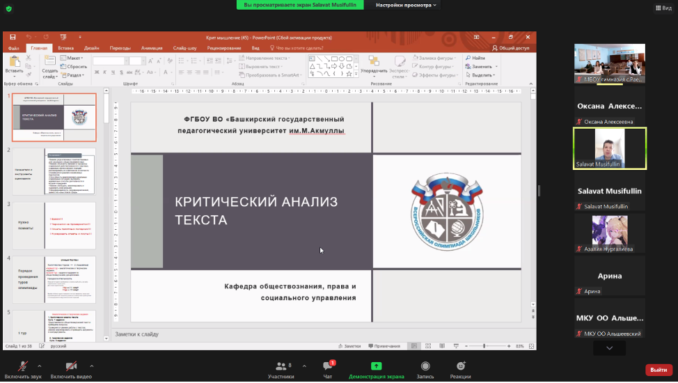 27 января 2022 г. преподавателями кафедры О.А. Шамигуловой и С.Р. Мусифуллиным был организован онлайн-семинар по подготовке к Региональному этапу Всероссийской Олимпиады школьников по обществознанию на тему "Критический анализ текста" для обучающихся психолого-педагогических классов, базовых школ, а также обучающихся средних образовательных учреждений Альшеевского района и Ишимбайской школы-предуниверсария Акмуллинского университета.