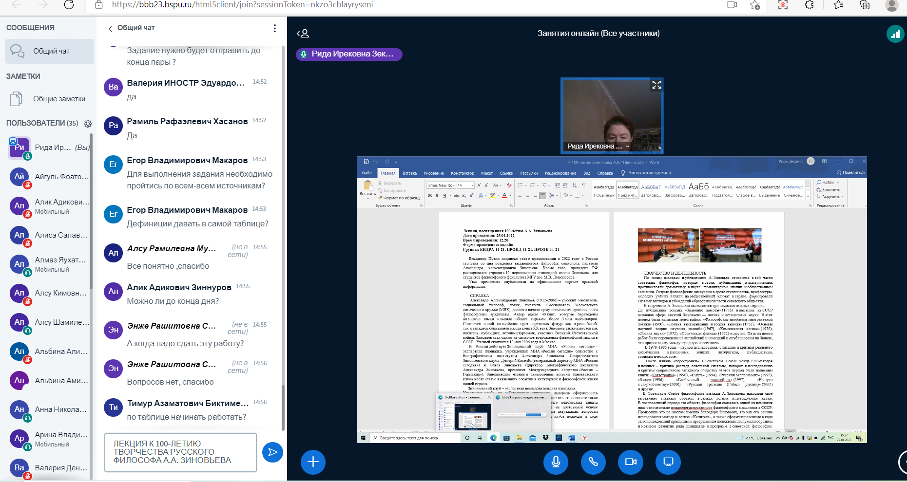 Профессором кафедры, доктором философских наук Ридой Зекрист была организованна дискуссионная лекция со студентами первых курсов, посвященная вопросам нравственности и этики в трудах ученого, а старшим преподавателем кафедры Флоридой Абдрахмановой со студентами первого курса была проведена проблемная лекция, посвященная вкладу А.Зиновьева в науку.