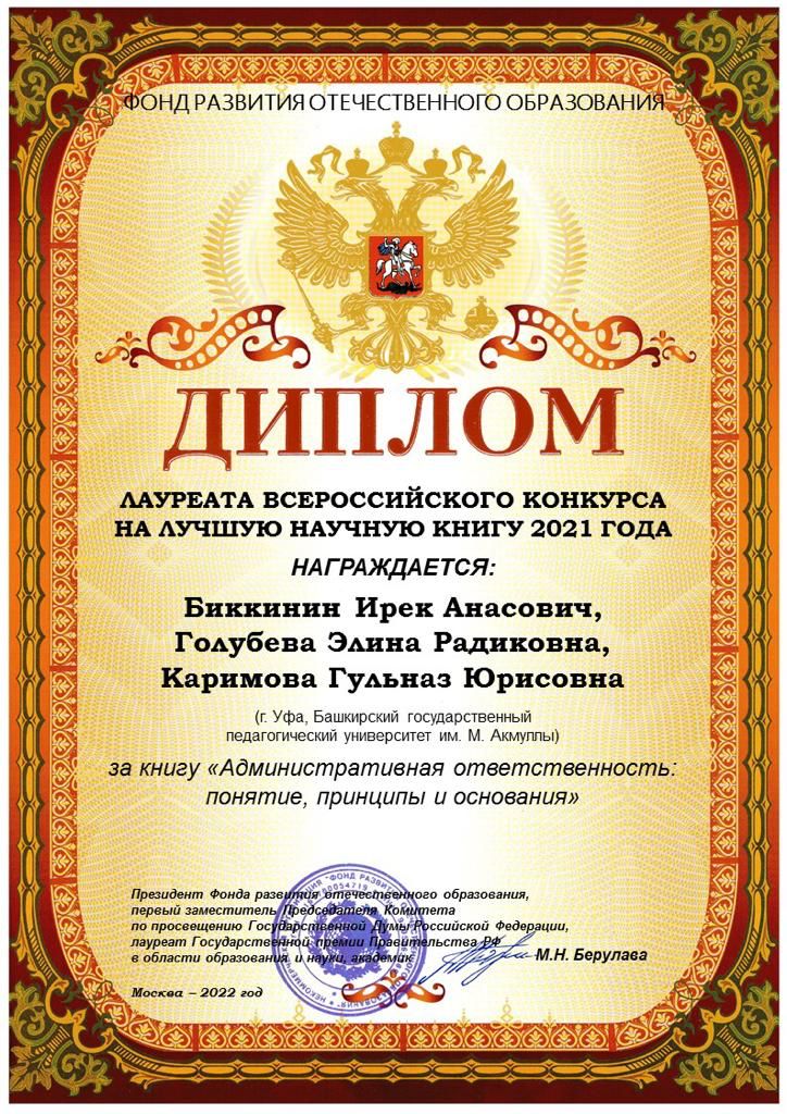 Профессор кафедры, доктор юридических наук Ирек Биккинин удостоен звания лауреата Всероссийского конкурса на лучшую книгу 2021 года. Научный труд "Административная ответственность: понятие, принципы и виды" стал одним из победителей в номинации "Юриспруденция". Конкурс проводился Фондом развития Отечественного образования.