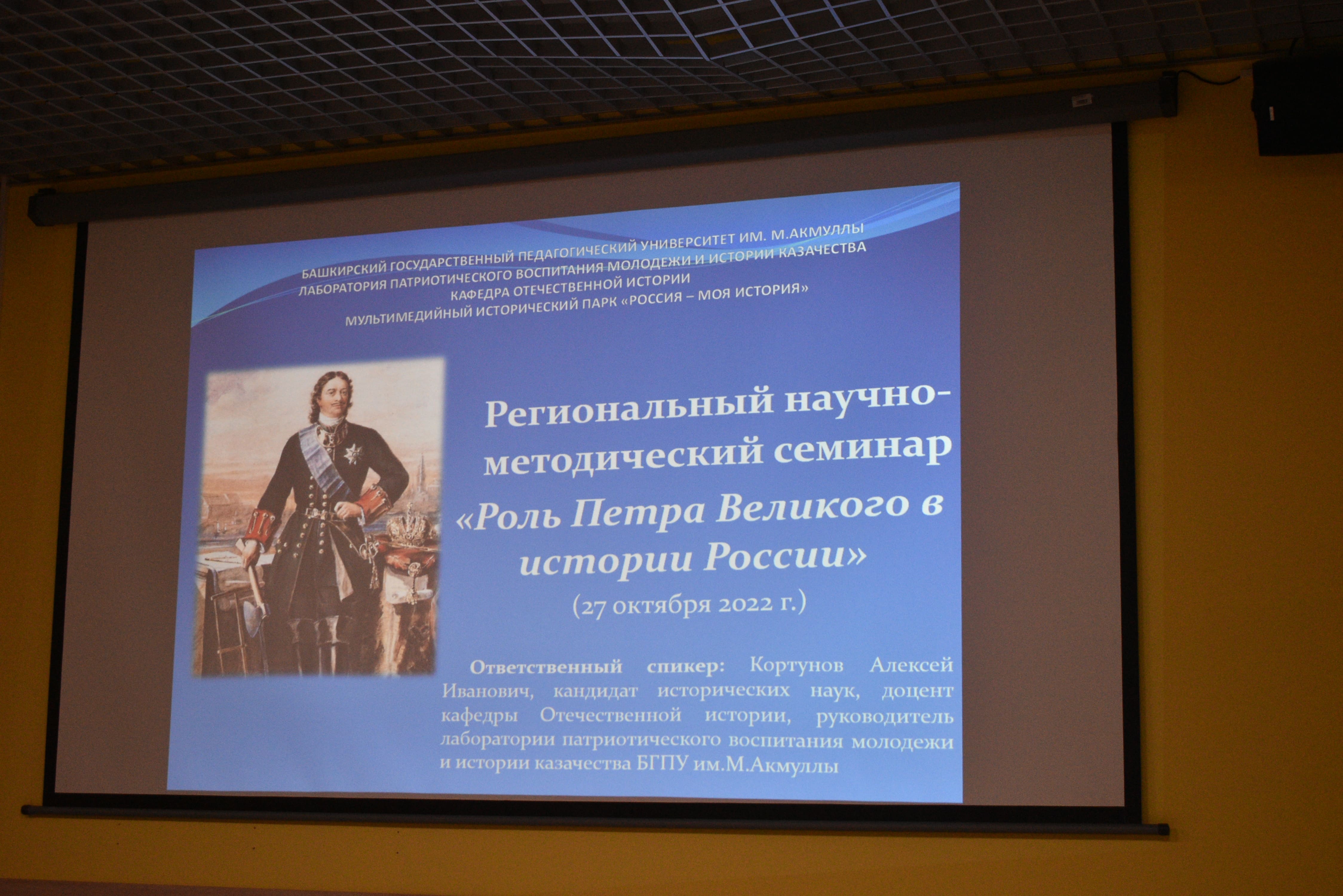 27 октября 2022 года на базе Мультимедийного Исторического парка «Россия – Моя история» (г. Уфа, ул. Менделеева 158, ТВК ВДНХ, 1 этаж) состоялся региональный научно-методический семинар «Роль Петра Великого в истории России». Семинар приурочен году празднования 350-летия со дня рождения первого российского императора Петра I. Организатором мероприятия выступили лаборатория патриотического воспитания молодежи и истории казачества, кафедра Отечественной истории Башкирского государственного педагогического университета им. М.Акмуллы. В научном семинаре приняли участие ведущие ученые БГПУ им.М.Акмуллы, БГУ, студенты 1 курса профиль «Обществознание и английский язык», 2 курса «История и обществознание». Спикером семинара выступил доцент кафедры отечественной истории А.И. Кортунов. В своем вступительном слове он отметил, что «с конца XVIII века не утихают споры о личности и характере Петра I.  Бесспорно, одно: великий русский царь Петр I известен во всем мире, а его влияние на развитие России неоспоримо».
