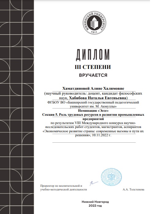 Состоялся VIII Международный конкурс научно-исследовательских работ студентов, магистрантов, аспирантов «Экономическое развитие страны: современные вызовы и пути их решения», в рамках XХ Юбилейной Международной научно-практической конференции преподавателей вузов, ученых, специалистов, аспирантов, студентов: «Промышленное развитие России: проблемы, перспективы», посвященной памяти доктора экономических наук, профессора Белоусова Рэма Александровича. Студентка 4 курса Алина Хаматдинова получила Диплом III степени в номинации "Эссе" Секции 5. Роль трудовых ресурсов в развитии промышленных предприятий. Научный руководитель - доцент Н.Е. Хабибова.