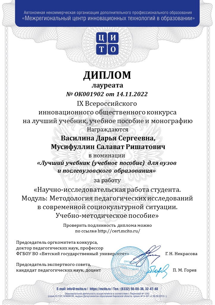 В ноябре 2023 г. на базе АНО ДПО «Межрегионального центра инновационных технологий в образовании» были подведены итоги Всероссийского конкурса на лучший учебник, учебное пособие и монографию. Дипломом лауреата были удостоены доцент кафедры культурологии и социально-экономических дисциплин Дарья Сергеевна Василина и доцент кафедры права, обществознания и социального управления Салават Ришатович Мусифуллин в номинации «Лучший учебник (учебное пособие) для вузов и послевузовского образования». На конкурс ими было отправлено новое учебно-методическое пособие «Научно-исследовательская работа студента. Методология педагогических исследований в современной социокультурной ситуации».