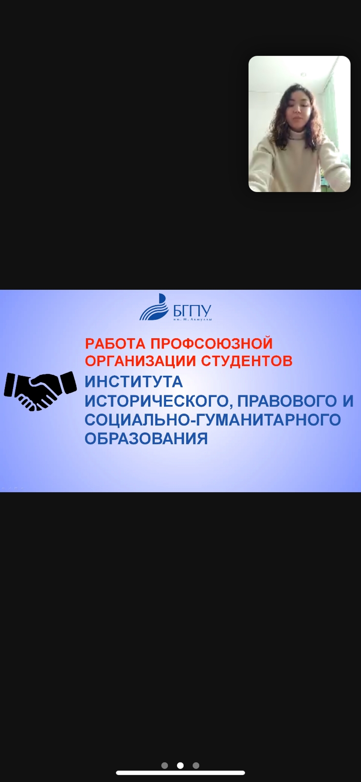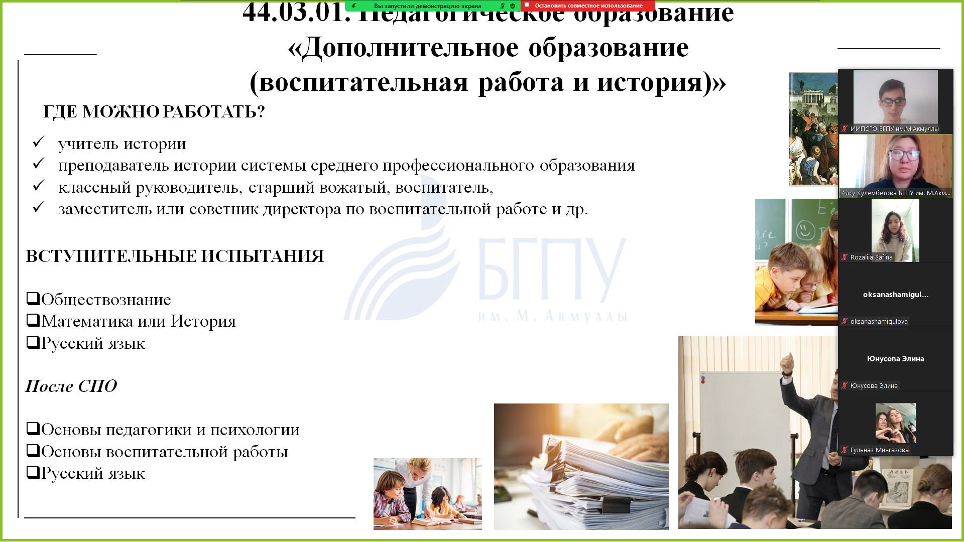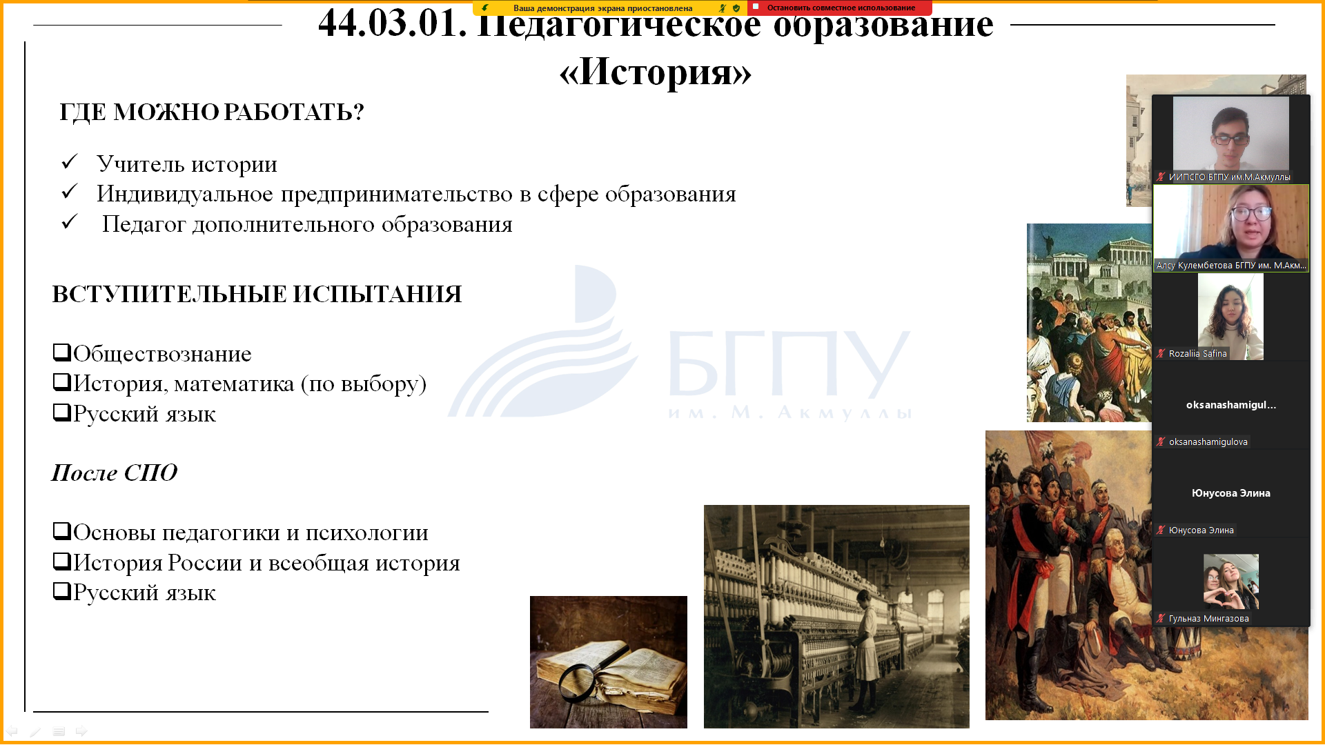 14 января 2023 года в Институте исторического, правого и социально-гуманитарного образования состоялась онлайн встреча с будущими абитуриентами в рамках Дня открытых дверей БГПУ им. М. Акмуллы. Представители администрации Института и студенческого самоуправления помогли абитуриентам узнать об Институте, разобраться в траектории поступления и определиться с направлением обучения.