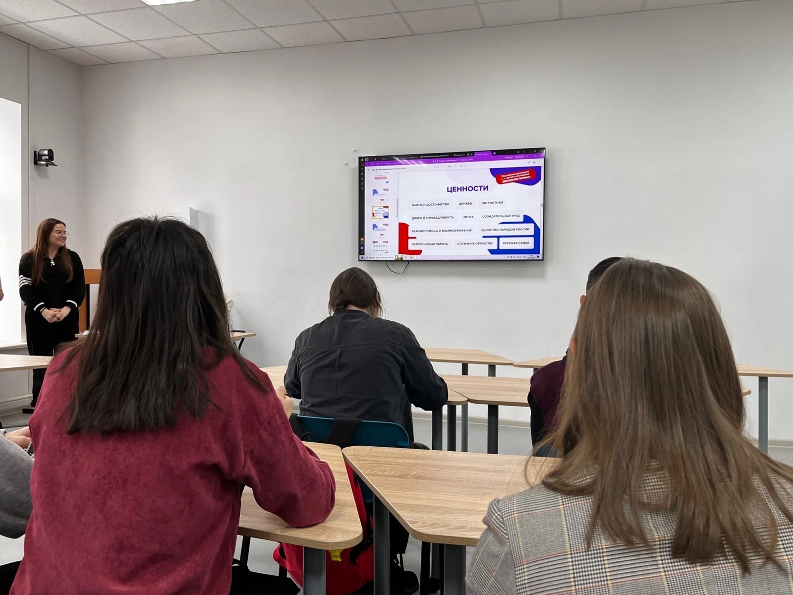 В рамках проведенного классного часа, студентам продемонстрировали обращение руководителя Российского движения детей и молодежи «Движение первых» Григория Гурова, который определил уникальные возможности, участников движения -  бесценный опыт общения со сверстниками, положительные эмоции, уверенные шаги во взрослую жизнь. Первокурсники познакомились с миссией, ценностями и основными направлениями деятельности Российского движения детей и молодежи «Движение первых», обсудили наиболее приоритетные ценности в рамках будущей профессии, среди которых –человечность, доброта, сохранение исторической памяти,  а также составили карту движения в соответствии с поставленными целями, в рамках направлений деятельности «Движение первых».
