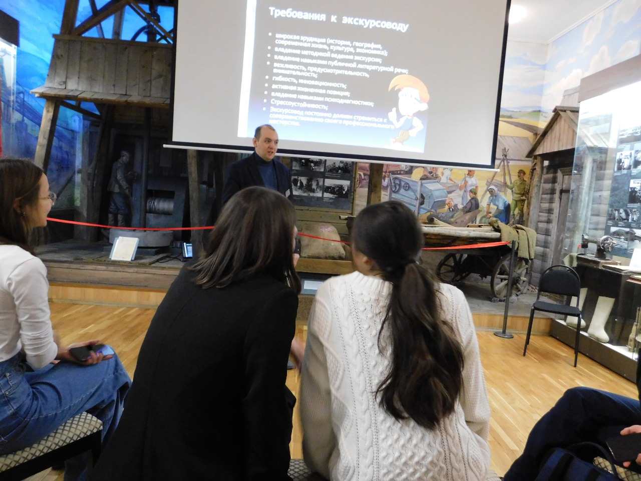 Студенты были ознакомлены с классификацией музейных экскурсий, особенностями проведения обзорных, тематических и учебных экскурсий, механизмом создания плана экскурсионного маршрута, отбором объектов показа. Отдельно ведущий мастер-класса остановился на приемах показа экспозиций и отдельных предметов выставки, приемах рассказа, описания, характеристики, комментирования, цитирования и т.д.