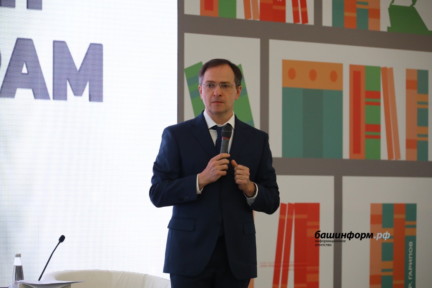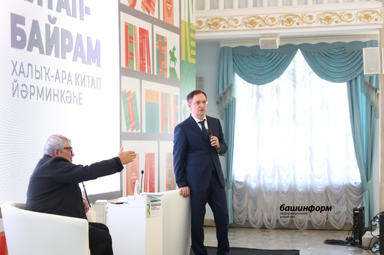 26 мая студенты и преподаватели Института исторического, правового и социально-гуманитарного образования в рамках работы Международной книжной ярмарки «Китап-Байрам» встретились с помощником Президента Российской Федерации, председателем Российского военно-исторического общества, соавтором учебников по истории Отечества – Владимиром Ростиславовичем Мединским . На встрече присутствовали учителя истории и обществознания города Уфы и Республики Башкортостан, преподаватели истории вузов города Уфы. Одной из ведущих тем встречи стал вопрос преподавания истории в современных условиях, связанных с изменившейся ситуацией в историческом образовании и искажением исторической правды со стороны западных историков. Владимир Ростиславович подробно остановился на вопросах создания нового учебника истории, который бы отвечал всем современным требованиям. Преподаватели и студенты Института исторического, правового и социально-гуманитарного образования приняли активное участие в обсуждении вопросов преподавания истории, в том числе методики преподавания. Владимир Ростиславович подробно ответил на все вопросы.