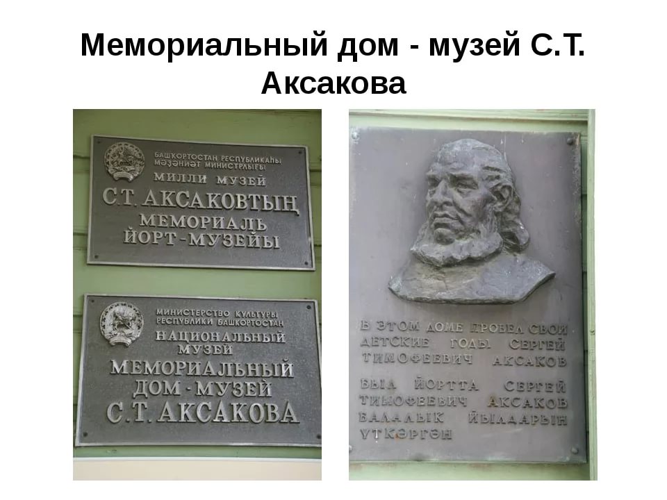 Мемориальный Дом-музей С. Т. Аксакова занимает деревянный особняк, построенный в стиле классицизма в середине XVIII века. Он является памятником истории и архитектуры. Располагается в живописном месте старого города на берегу р. Белой по адресу: Россия, Республика Башкортостан, Уфа, улица Зайнуллы Расулева, 4.