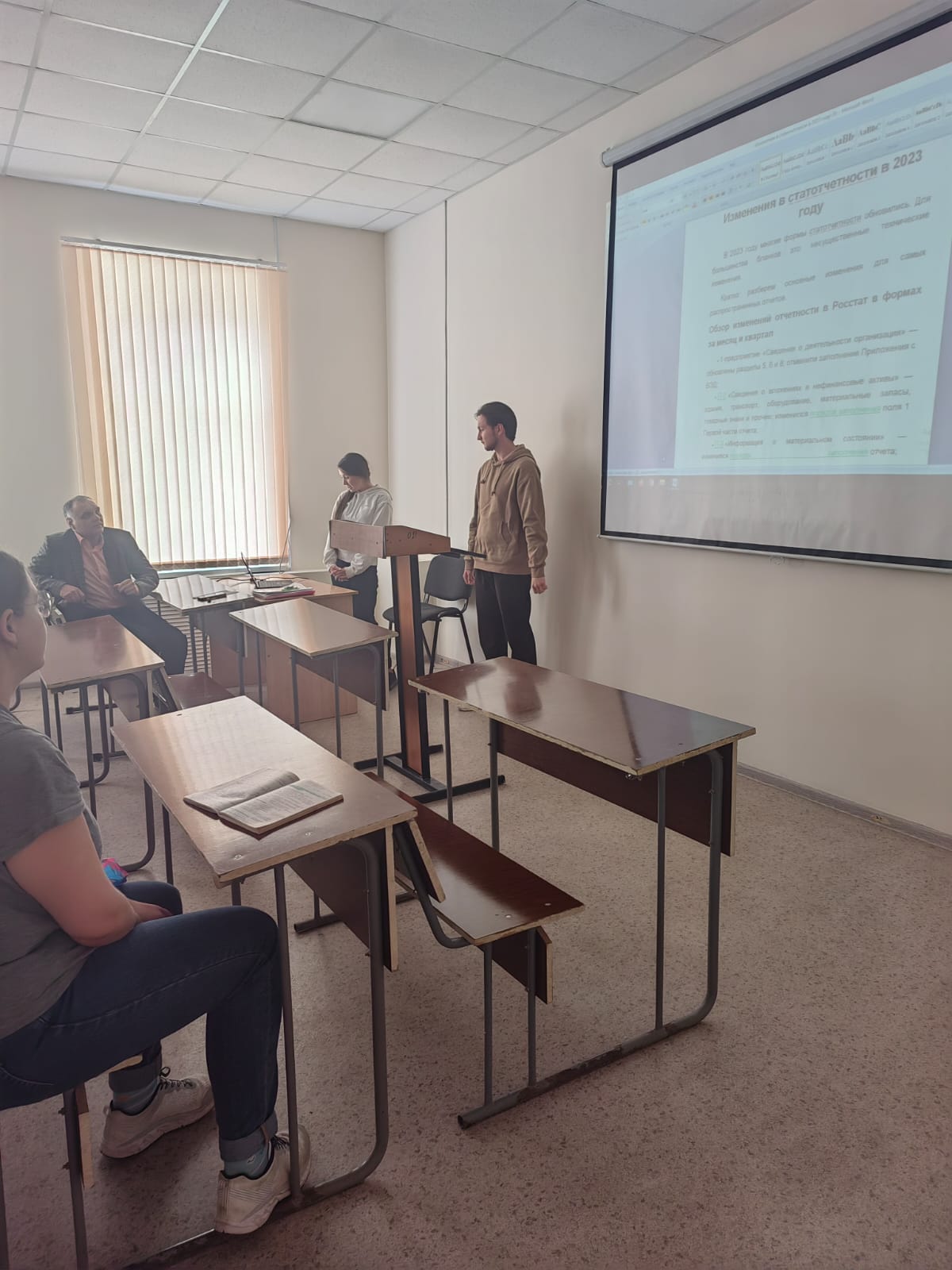 В свою очередь со своими докладами по теме «Изменения в статотчетности в 2023 году» выступили студенты Каримова Карина и Ишмуратов Камиль. Они рассказали что Росстат ввел новые формы для предоставления отчетов за 2022 и 2023 годы по труду. Отчетность по зарплате и кадрам теперь принимается в новом формате согласно приказу №532 от 29.07.2022. А согласно приказу №533 от 29.07.2022 изменились годовые и месячные формы для производственников. Были изменены и утверждены следующие формы федерального статистического наблюдения по кадрам. А также какие  предусмотрены штрафы за не сдачу  форм в Статистику или нарушение сроков на 2023 год.