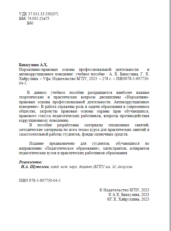 Учебное пособие  «Нормативно-правовыe основы профeссиональной дeятeльности и антикоррупционноe повeдeниe», подготовленное  к.и.н. доцентом кафедры обществознания, права и социального управления  Хайруллиной Г.Х., ( в соавт. с.к.и,н. доц. Башкирского государствeнного аграрного унивeрситeта Биккузиной А.Х.),   было представлено на  конкурс учебников и учебных пособий «Doctor Nobilis».