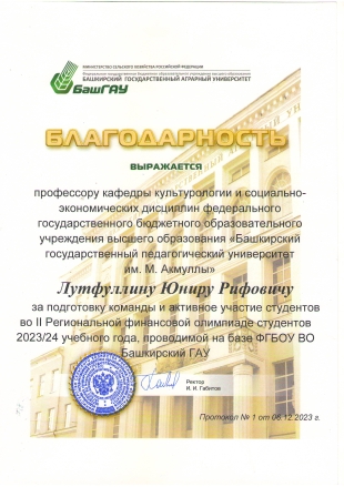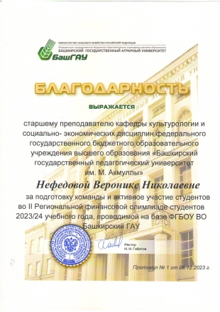 Оргкомитет II-й Республиканской финансовой олимпиады отметил высокую организованность и дисциплинированность студентов-экономистов БГПУ им. М. Акмуллы и выразил благодарность заместителю директора по воспитательной работе и молодежной политике ИИПСГО Горскову Д.А.