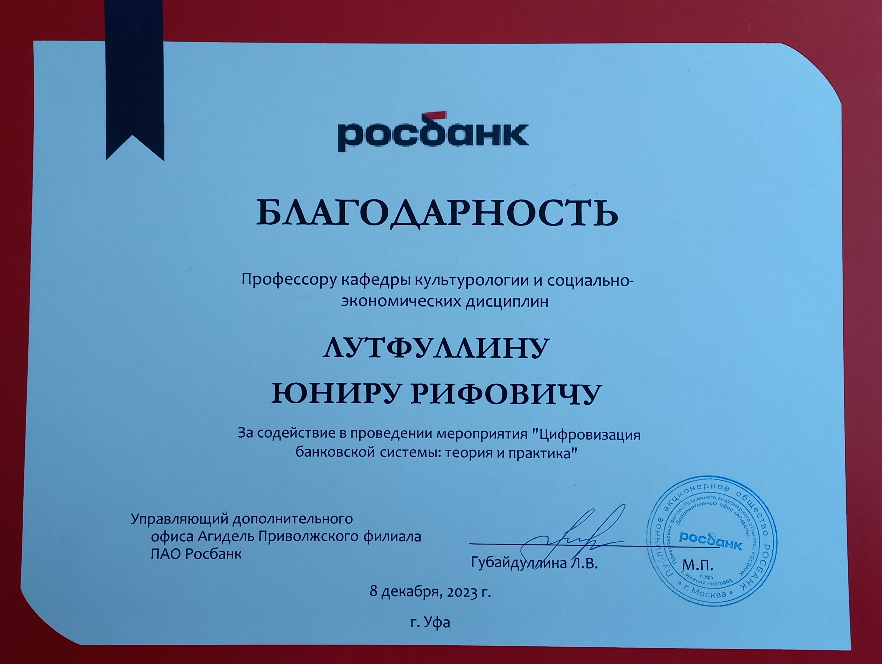 8 декабря 2023 года в ИИПСГО БГПУ им. М. Акмуллы прошел семинар «Цифровизация банковской системы: теория и практика», организованный центром развития предпринимательских компетенций «Профи-Т» (руководители Лутфуллин Ю.Р. и Нефедова В.Н.) и ПАО Росбанк.