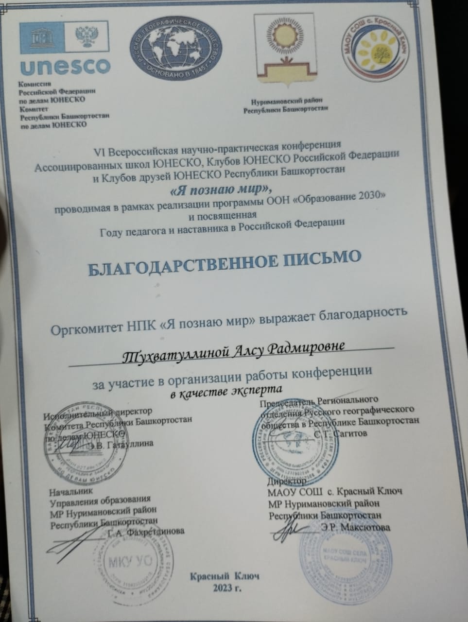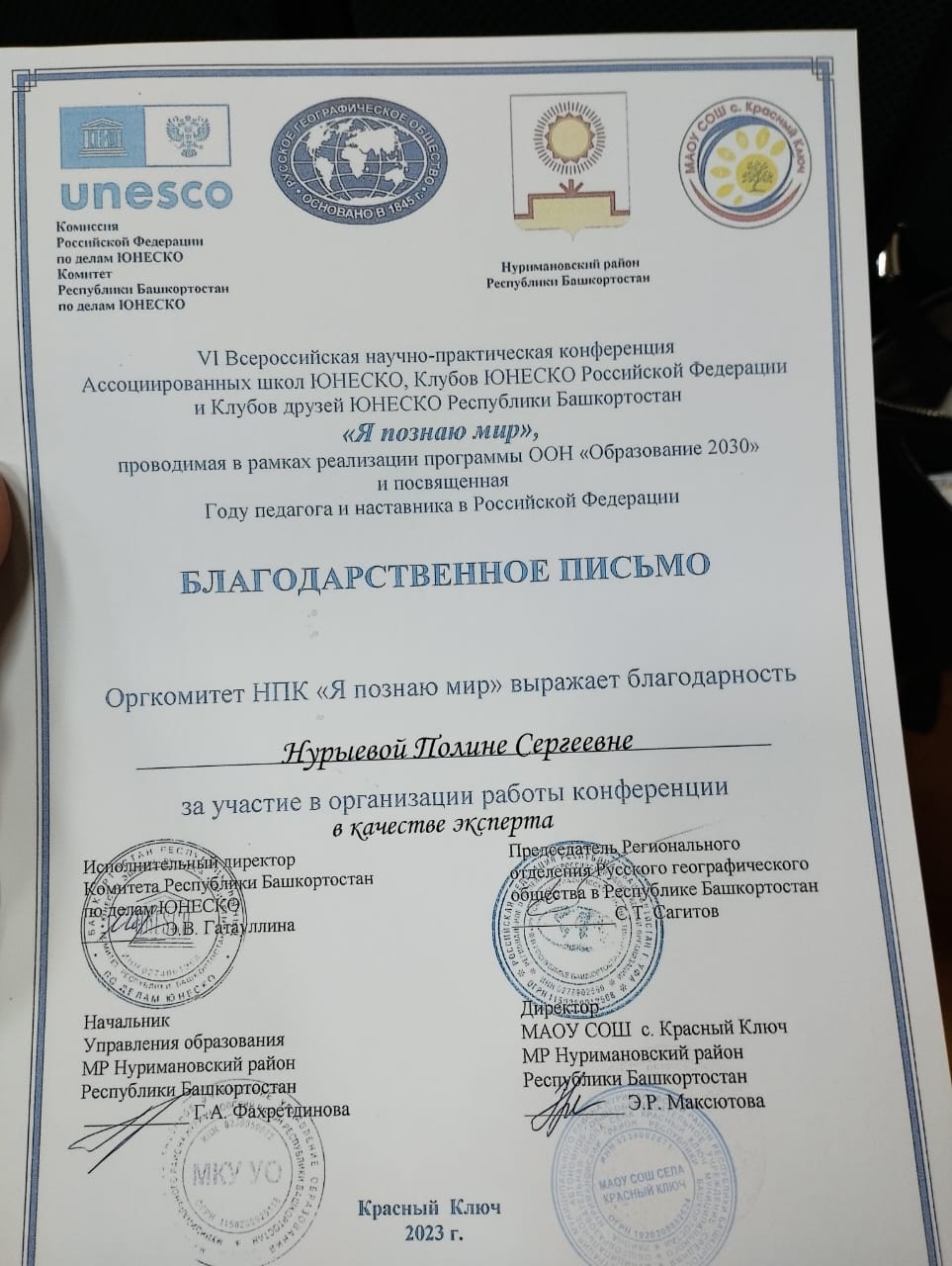 15 декабря на базе МАОУ СОШ с. Красный Ключ в рамках реализации программы ООН «Образование 2030» прошел очный этап VI Всероссийской научно-практической конференции Ассоциированных школ, Клубов ЮНЕСКО Российской Федерации и Клубов друзей ЮНЕСКО Республики Башкортостан «Я познаю мир», посвященной Году педагога и наставника в Российской Федерации.