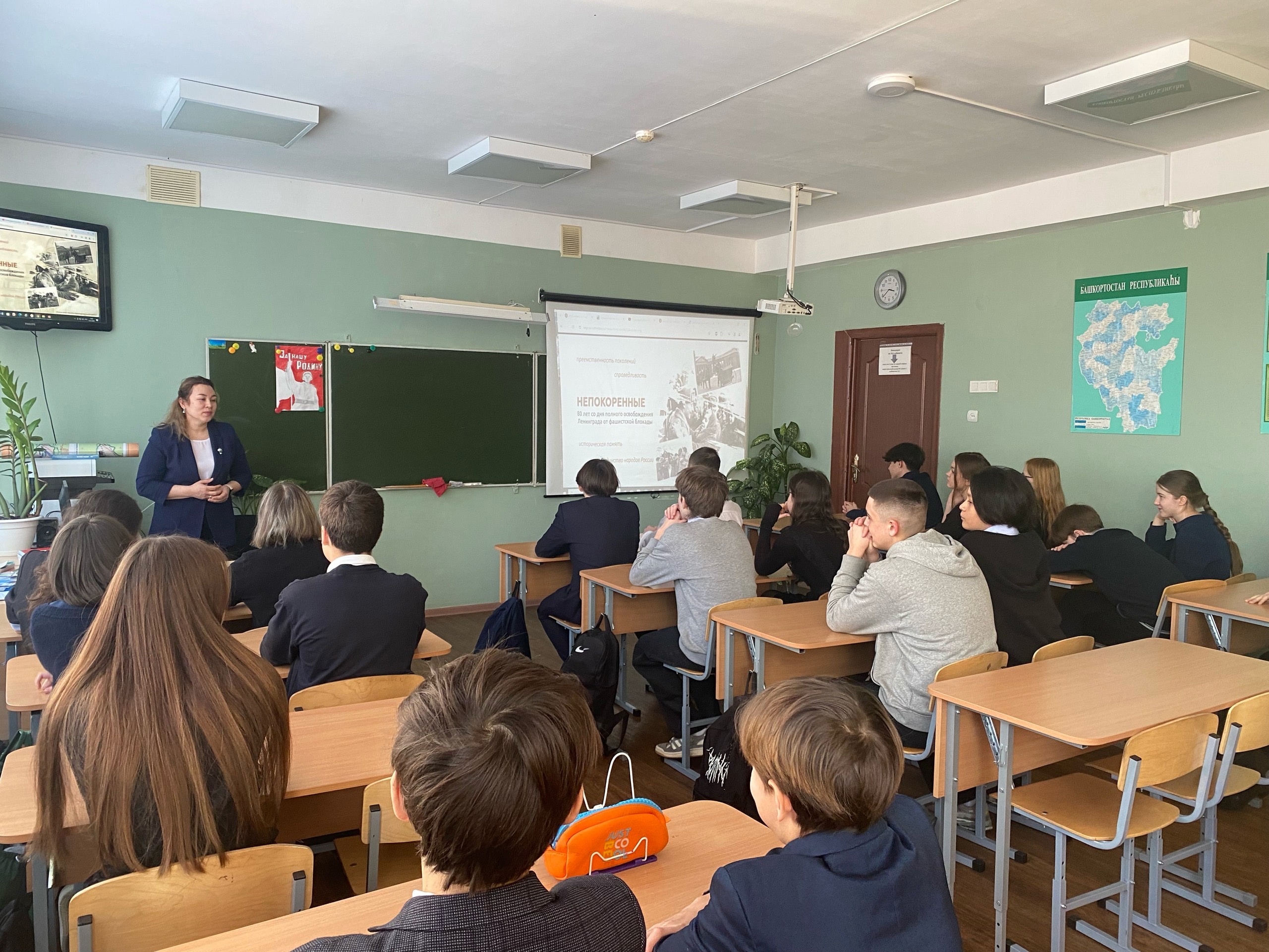 22 января в школе № 18 г. Уфы состоялось внеурочное занятие для учащихся 8 класса. Темой «Разговоров о важном» – «Непокоренные» стала годовщина полного снятия блокады Ленинграда 80 лет назад – 27 января 1944 года. Доцент кафедры отечественной и всеобщей истории Гашура Лукманова рассказала школьникам о жизни людей блокадного Ленинграда на протяжении почти 900 дней: без тепла, без еды, электричества, под постоянными обстрелами. Ребята высказывали свои суждения о героизме, взаимопомощи, нравственном выборе на войне. Очень важно бережно относиться к памяти о событиях тех лет, стойкости ленинградцев. Память об этом сохраняется не только благодаря книгам, фотографиям, художественным фильмам, но и благодаря таким разговорам, который состоялся в базовой школе Акмуллинского университета.