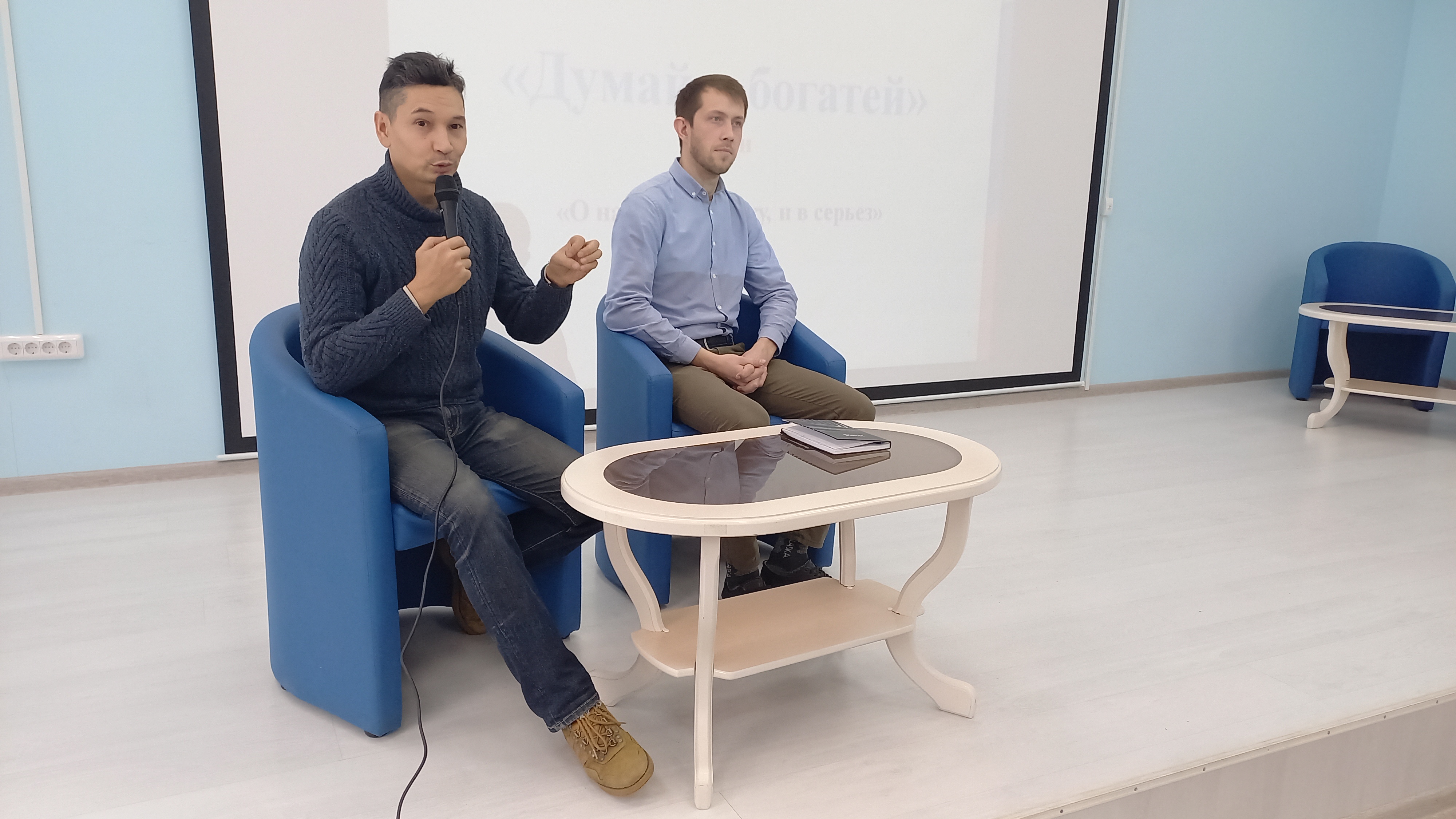 Медиачас «Думай и богатей» состоялся 2 февраля 2024 года в 14 часа в ауд.5. На встрече с организаторами бизнес-игры Булатом Арсланбаевым и Акрамом Бекмухамедовым принимали участие студенты 4-го курса ПОМХЭК-51-19, 3-го курса БИДРА-31-21, 4-го курса ПРОПД-41-20 и 1-го курса ПРОЭК-11-23. Вел медиачас профессор кафедры культурологии и социально-экономических дисциплин Лутфуллин Ю.Р.