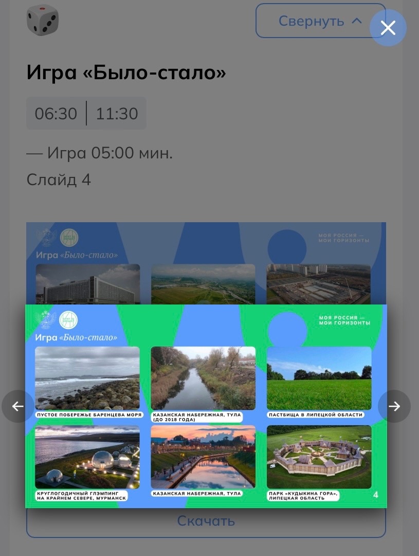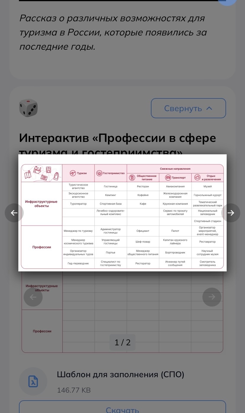 Также в материалах к занятию предложен ролик с выставки «Россия». Представлены материалы игр «Было-стало», интерактив «Профессии в сфере туризма и гостеприимства», видеоролик «Россия — моё будущее» и игра «Будущее или реальность».