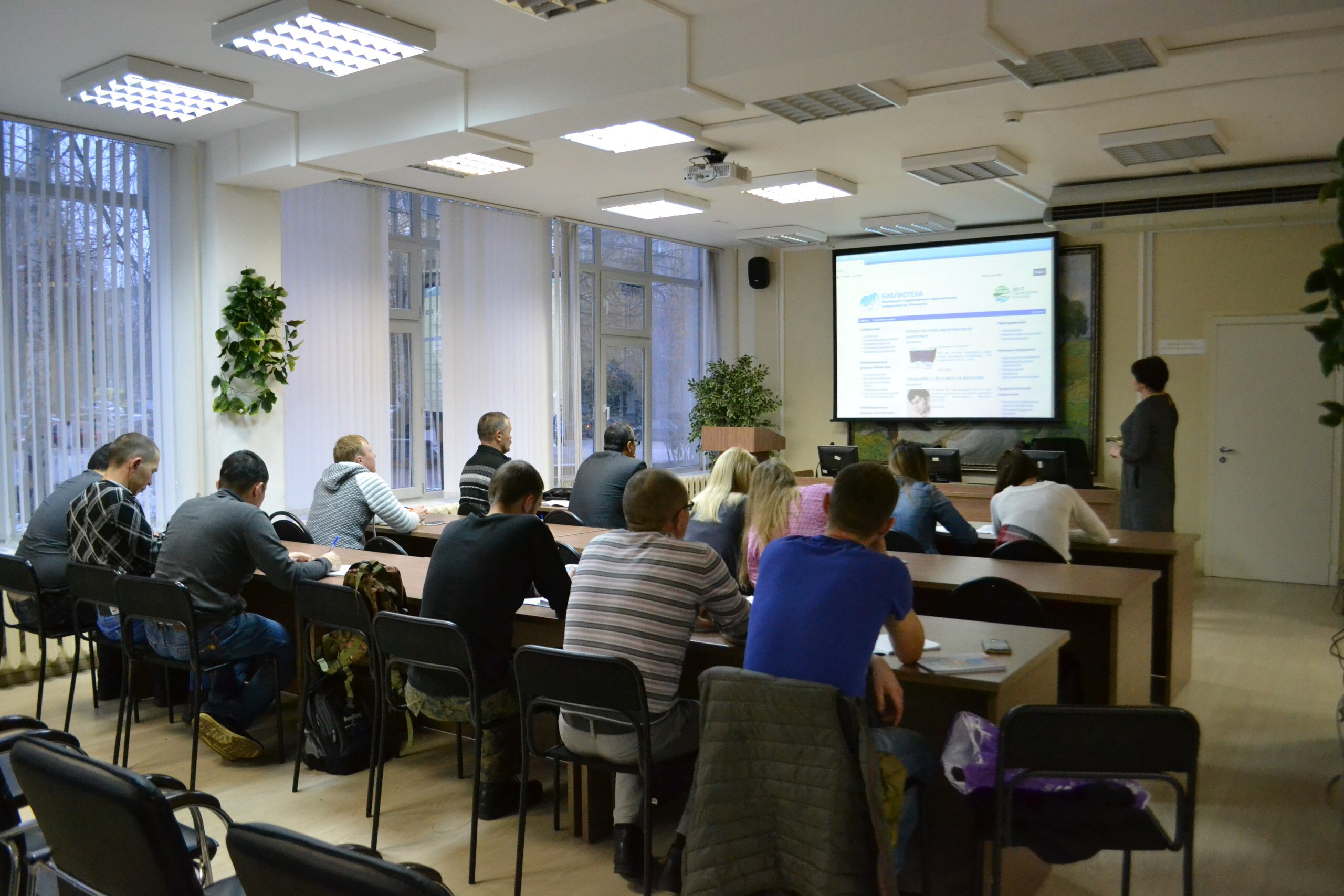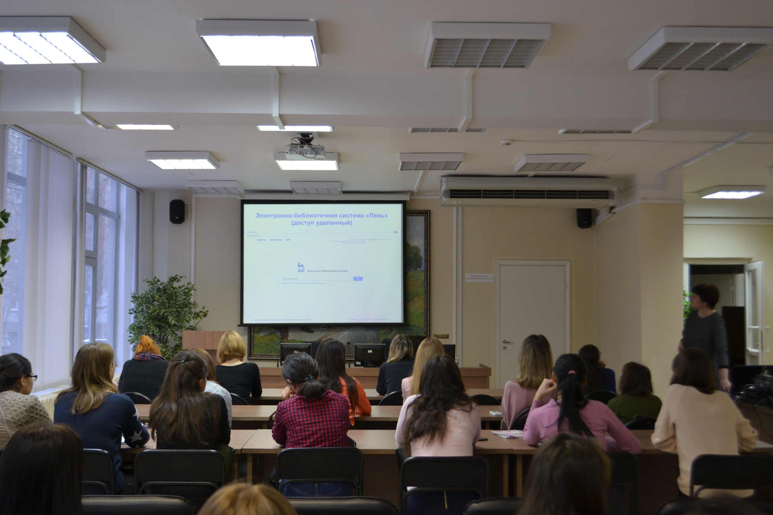 Директор библиотеки, Елена Евгеньевна Скрипник, рассказывала слушателям обо всех возможностях библиотечной системы, об огромном ассортименте книг и журналов, а также и о приёме и сдаче произведений. Позже студенты познакомились с сайтом библиотеки, а затем и прошли регистрацию в электронной библиотеке университета, чтобы получить бесплатный доступ к её фонду.