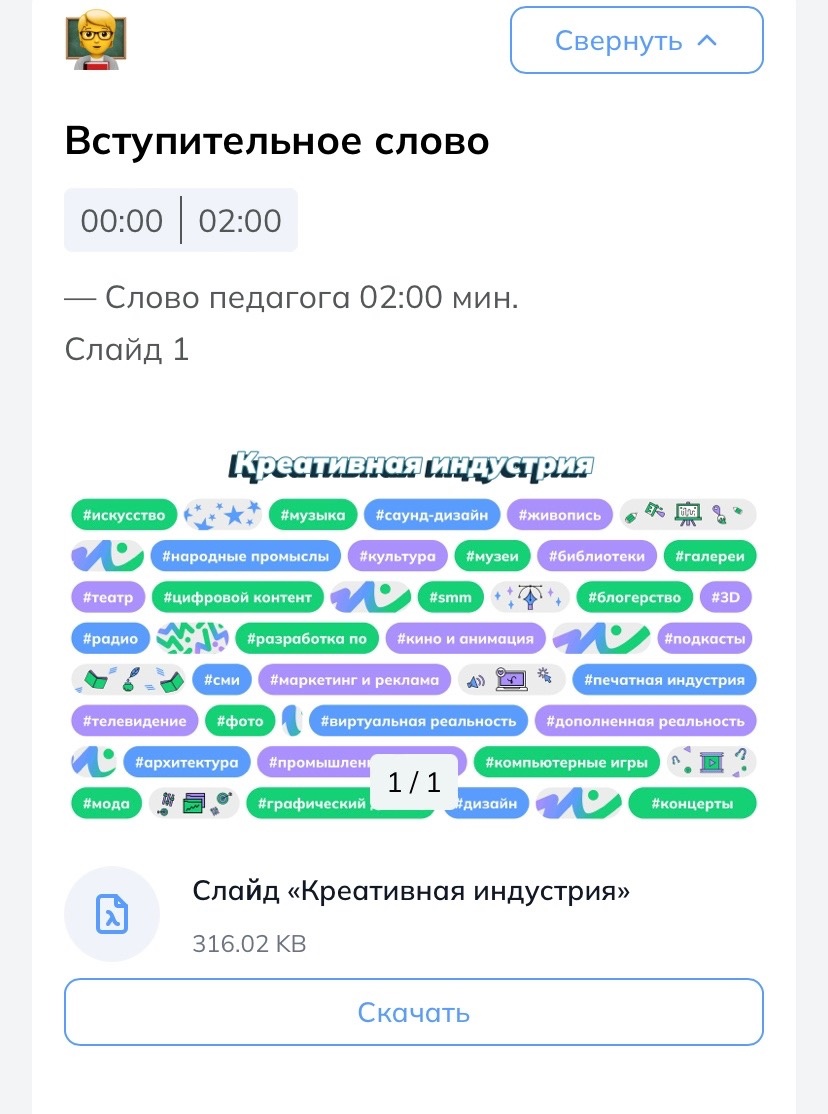 Темой третьего занятия стала: «Россия креативная: узнаю творческие профессии». В рамках беседы рассматриваются основные достижениях нашей страны в сфере творчества, идет разговор про все то, что делает наш досуг приятнее, комфортнее, интереснее.
