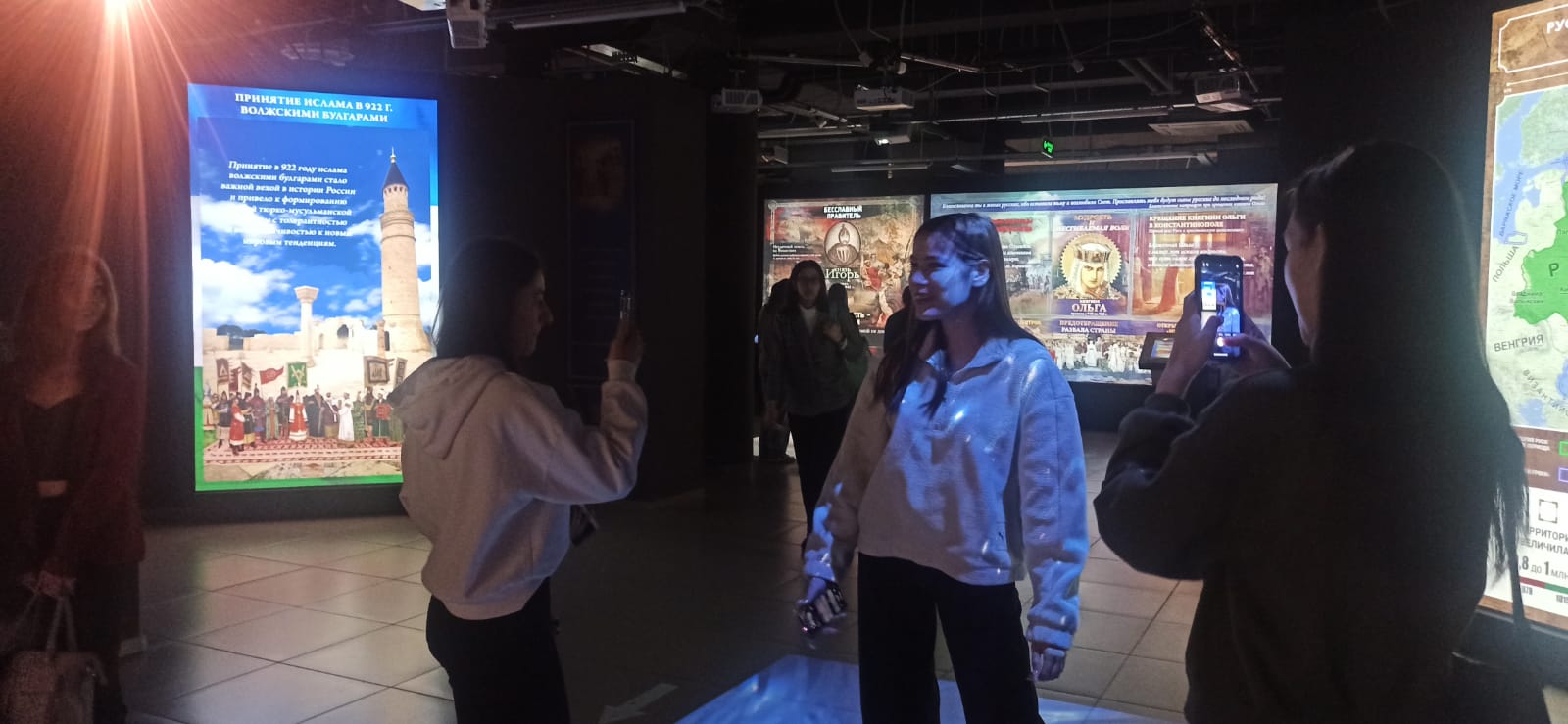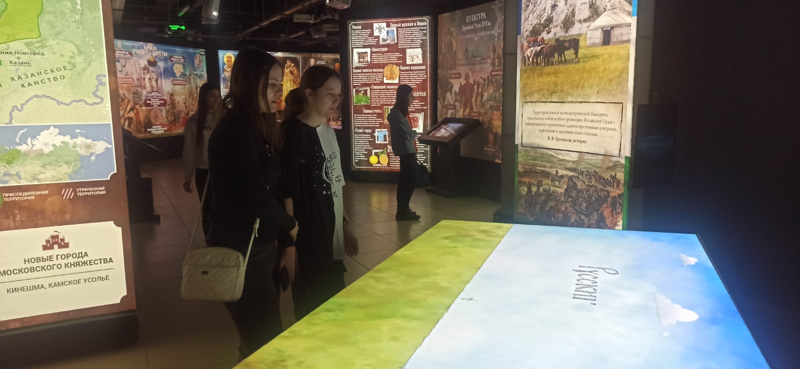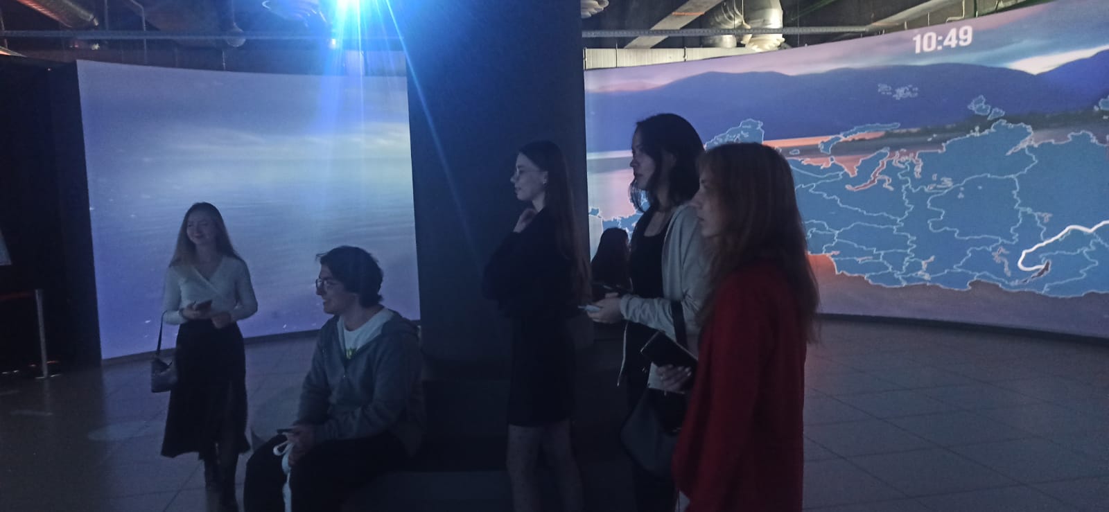 Отдельное внимание студентов было посвящено мультимедийной экспозиции «Просвещение. Большие перемены». Данная экспозиция представляет собой наглядную иллюстрацию эволюции системы образования в стране от периода Советского Союза до современной России.