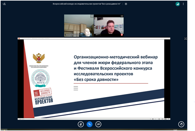 8 апреля 2024 года на базе Московского педагогического государственного университета в дистанционном формате состоялся организационно-методический вебинар для членов жюри федерального этапа и Фестиваля Всероссийского конкурса исследовательских проектов «Без срока давности» среди обучающихся 8–11 классов образовательных организаций, реализующих образовательные программы основного общего, среднего общего образования и обучающихся образовательных организаций, реализующих образовательные программы среднего профессионального образования, в 2024 году.