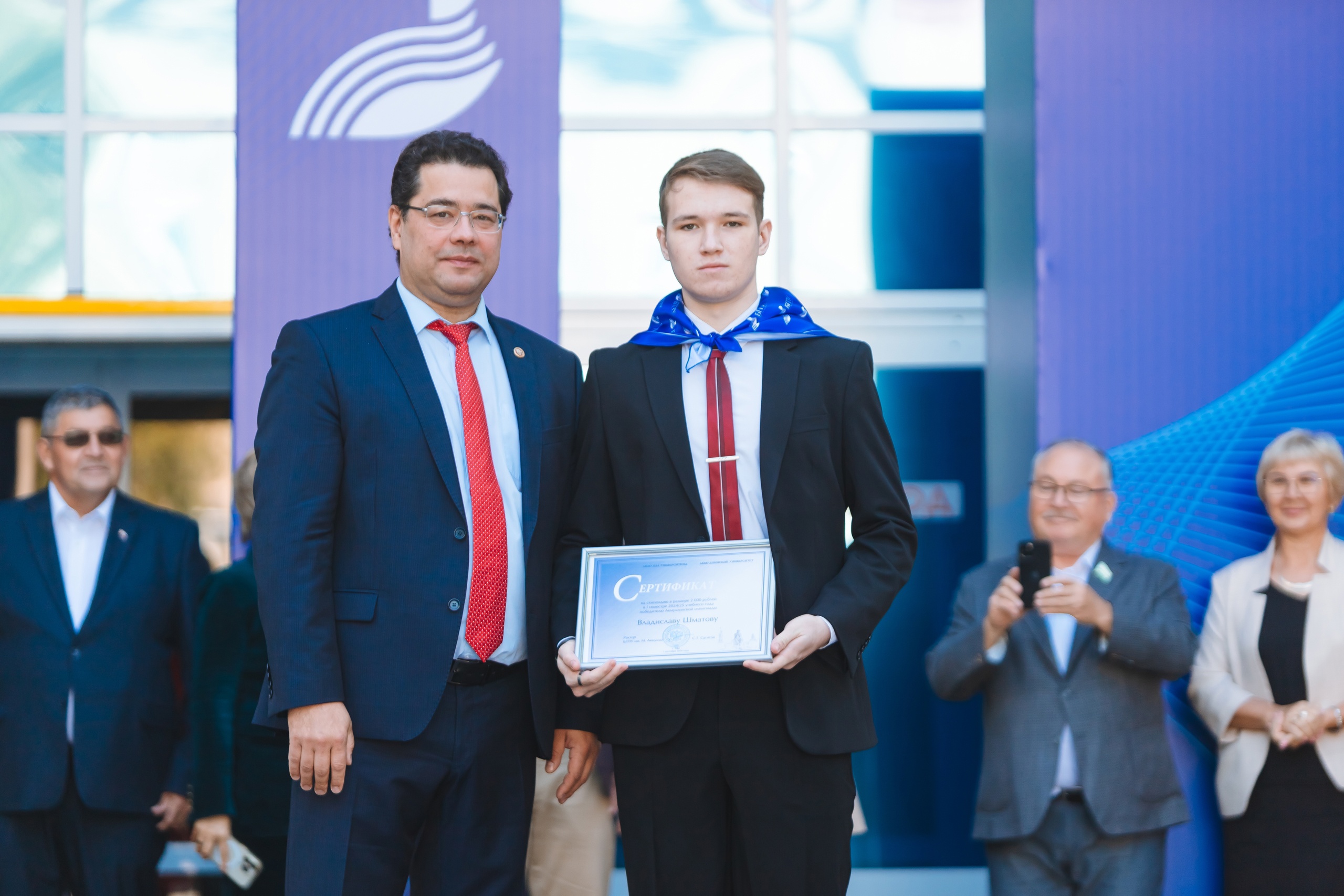 Восемь первокурсников, ставших в прошедшем учебном году победителями и призерами Акмулллинской олимпиады, получили из рук ректора сертификаты на выплату в течение первого семестра специальной стипендии. В их число вошел и студент Института исторического, правового и социально-гуманитарного образования – Шматов Владислав (направление 44.03.05 Обществознание и право)