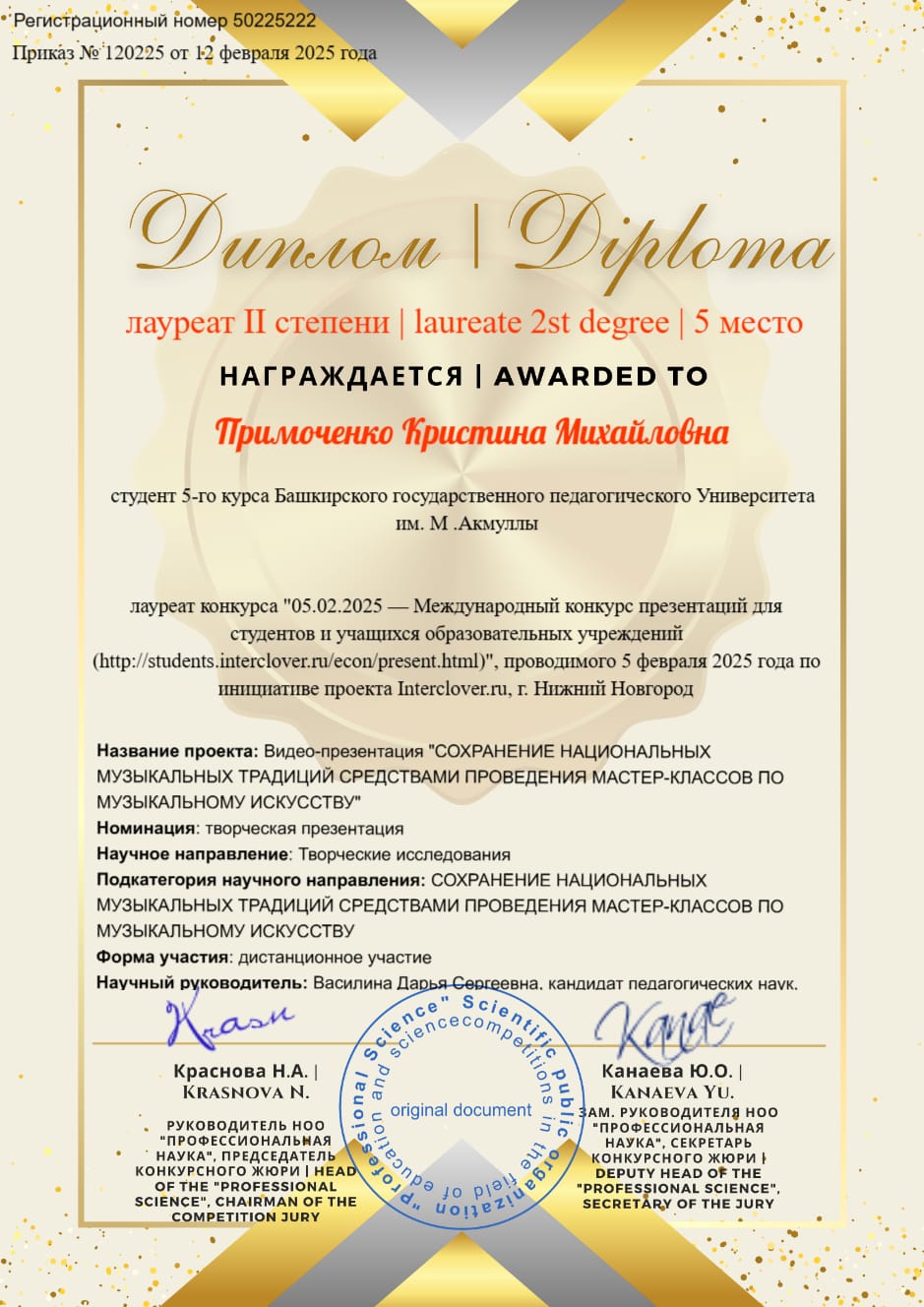 В г.Нижний Новгород были подведены итоги Международного конкурса презентаций для студентов и учащихся образовательных учреждений. Участниками конкурса стало более 120 студентов из России и ближнего зарубежья. Акмуллинский университет представляла студентка 5 курса Института исторического, правового и социально-гуманитарного образования, участница Центра развития компетенций "Адитон" Кристина Примоченко. Она презентовала научный проект "Сохранение национальных музыкальных традиций средствами проведения мастер-классов по музыкальному искусству" (руководитель Д.С.Василина). Она стала победителем международного конкурса презентаций, став лауреатом II степени в номинации "Творческая презентация" по направлению "Творческие исследования ".